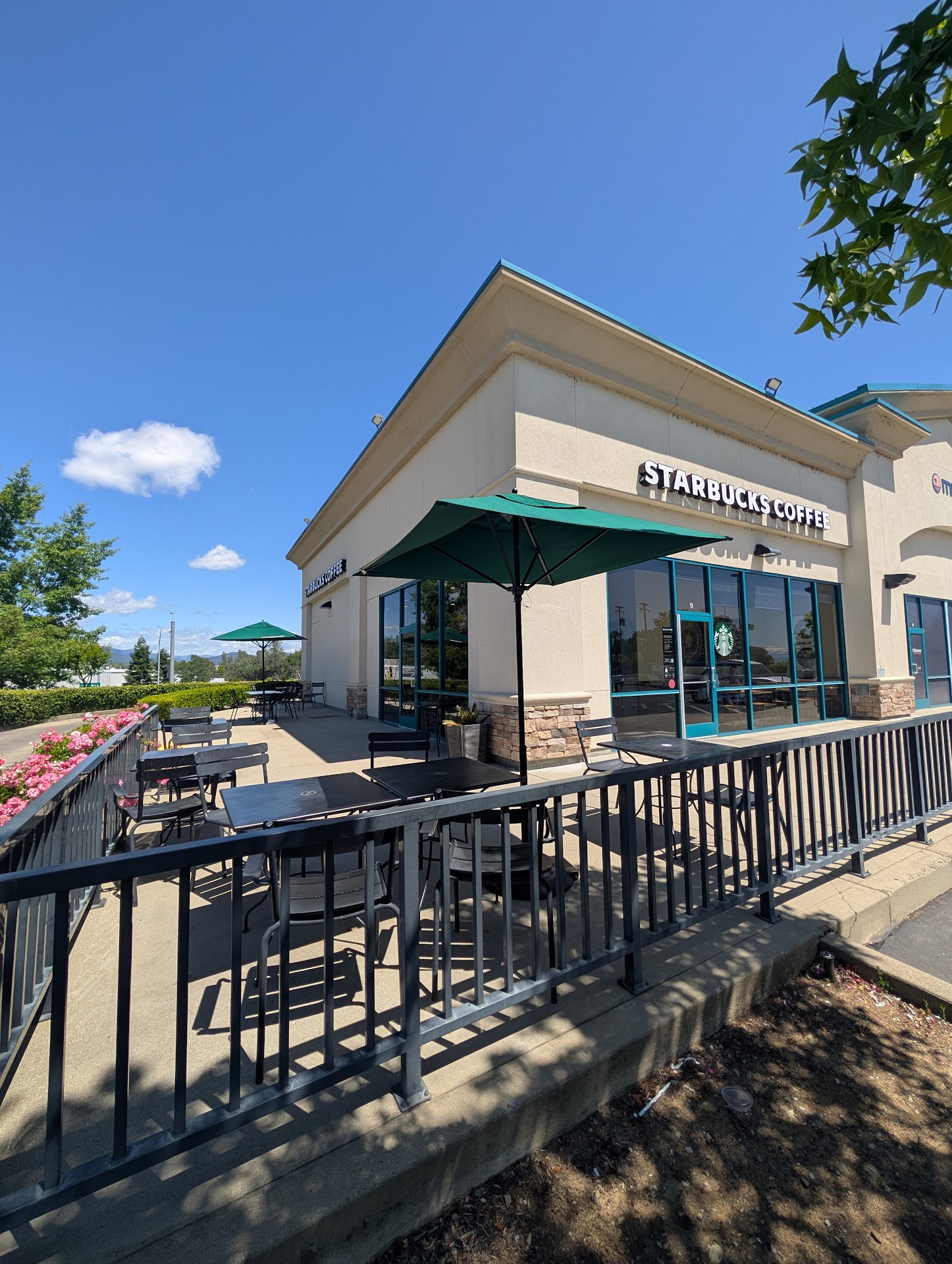 tl;dr: a peaceful and sunny Starbucks with shaded outdoor seating, friendly staff, and a surprising charm, especially with spring flowers and wide-open views.