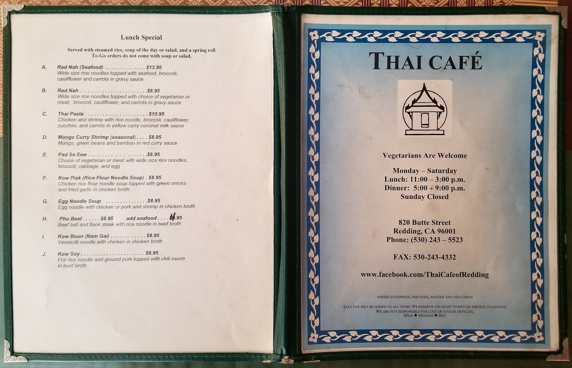 Read moreThai Cafe of Redding is GREAT! So far, everything I've tried is fresh and tasty. The ingredients in each dish are high quality, and you can savor the authentic flavors. The vibrant herbs, aromatic spices, and perfectly cooked proteins combined to create a memorable culinary journey. For those who appreciate a little heat, the extra-spicy options are a must-try. The chefs at Thai Cafe know how to balance heat with flavor, ensuring each bite is an explosion of taste. Whether it's a spicy curry or a fiery stir-fry, the extra spicy offerings are a real treat for the taste buds. If you like fresh, flavorful, and just the right amount of spicy Thai cuisine, Thai Cafe of Redding is the...