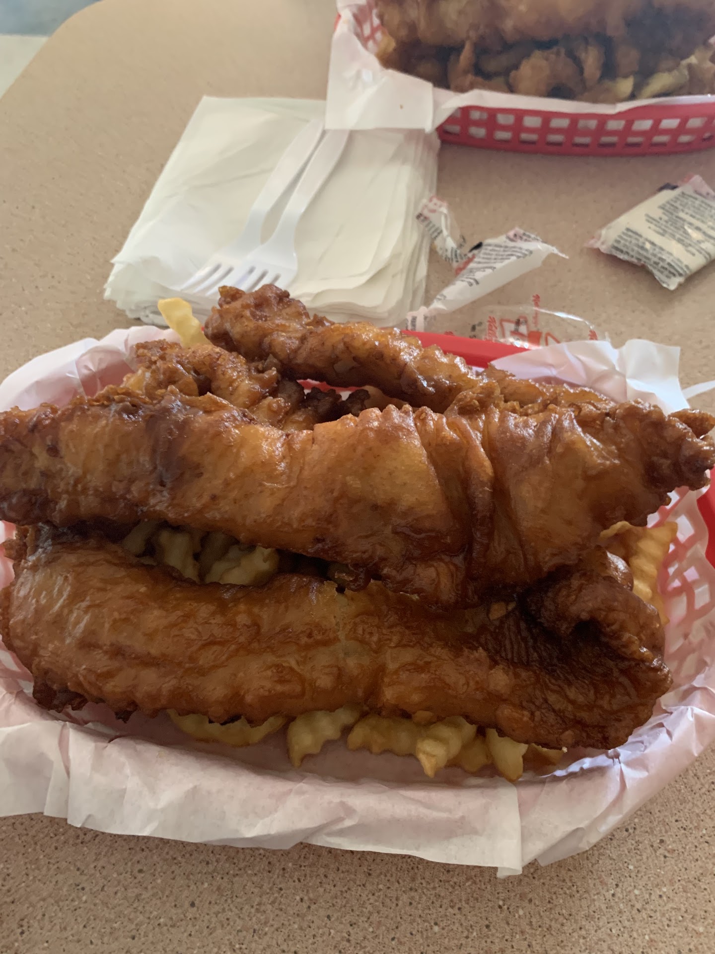 This place has top notch fish and chips..nice sized portions that are definitely shareable even if the person ur sharing with doesn't have a small appetite lol. The batter they use is seasoned perfectly and crispy. Fries are jus the crinkle cut but delicious. Basically everything is fried lol with the exception of salad so we go here maybe twice a year when we get an itchin' for some local top notch fish n chips. Don't waste your time going anywhere else to be disappointed. The popcorn shrimp, calamari, fried zucchini and mushrooms are all SMACKIN' as well oh yeah there are some grilled options and clam chowder but I haven't tried it, I'm usually craving fish n chips but maybe I will venture out to something different next time being I havnt been disappointed yet and food has always been consistent. As far as cleanliness, it is clean. They have beer and soda options and also nuggets as an option for kids if ur kiddo isn't into fish. The service..HANDS DOWN THE BEST FOLKS WORKING HARD HERE! Friendly and awesomeness pours out from our friendly person taking our order at the counter down to the server and the cook! You guys are the backbone...🤭 Pun intended of this establishment. Thank you guys for your refreshing service, wonderful food and clean place to come in and enjoy a meal as a couple or...