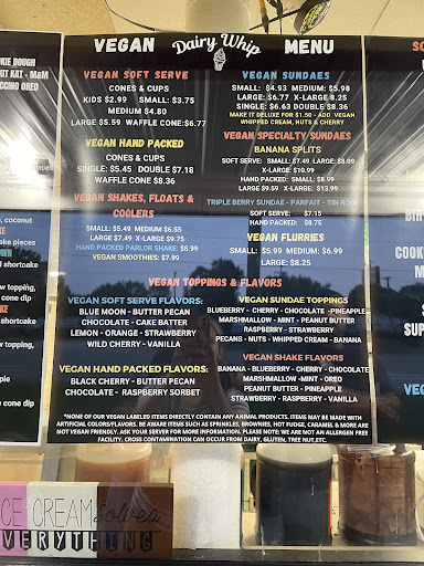 Read moreMy family of 5 visits Dairy Whip frequently and we always have a great experience. The staff is friendly and the area is clean. We have used the drive through as well as the walk up service. Walk up is usually faster if the drive through line has more than 4-5 vehicles waiting, so we prefer that option when the weather is nice. Our family of five has different dietary needs. Three of us avoid dairy for health reasons and we have enjoyed Dairy Whips abundant vegan options. We visit many ice cream shops in Michigan while camping and haven't found another place that offers as many vegan choices as Dairy Whip! My young son has an anaphylactic peanut and tree nut allergy. We are aware of the risk we take when we allow him to eat anything outside our home and we always carry two epipens at all times. Dairy Whip has numerous signs warning of cross contamination and risks associated for individuals with allergies. I have spoken with the staff to discuss what maybe the safest option for anyone with nut allergies. After learning more about their menu and ice cream making process we have decided to only allow him to order ice cream from the vanilla or chocolate soft serve machine. We always make his nut allergy known before placing the order and the staff kindly wears gloves to make it. He usually requests it on a cone or a cone on top, which we are also comfortable with. We do not allow him to have any extra toppings or dips due to the beey high risk of cross contamination. We often bring a baggie of crushed Oreos from home to sprinkle on ourselves before he enjoys it. Dairy Whip is pet friendly! The staff loves to see pets! They offer doggie ice cream treats, too! We will continue to recommend Dairy Whip to our...