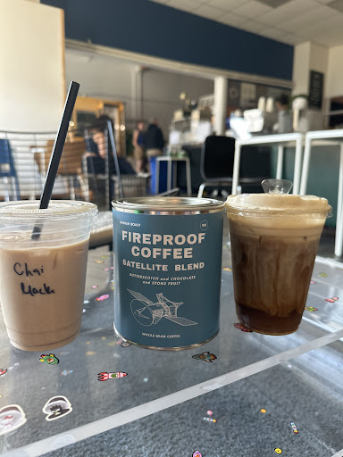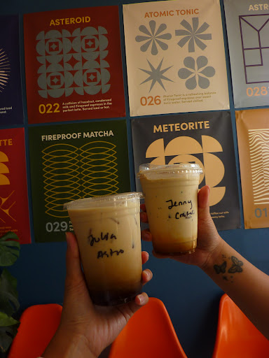 Upon entering, you're met with a small area decorated with cool space retro vibes with chairs and a bunch of plants, which I love. I thought the place was empty until we walked further in and the coffee shop opened up and it was full of people and vibrant. I like that the back is opened to the outside which really brightens up the space and gives outdoor vibes indoors. The place is clean, well decorated in their theme of vintage space with really nice touches. Merch is attractive and displayed nicely. When we got to the front of the line we were warmly welcomed and greeted by Tim (if my memory serves me right, if not, sorry!) He introduced us to the owners Josh & Bryan, and though they were busy, they took the time to stop, look up at us and say hello. Huge difference from the corporate coffee shops. Nice touch with being very friendly and personable.