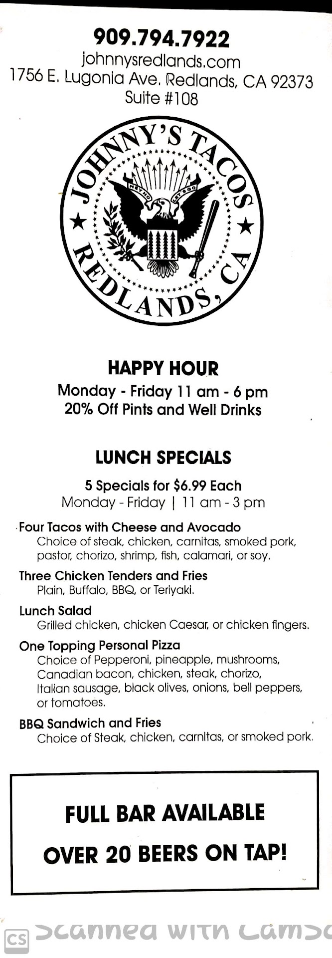 Read moreJohnny Tacos and Sports located in Redlands California is conveniantly located off of Lugonia Blvd. They feature a wide selection of made to order foods including burgers,wings,appetizers and delicious "Street" style tacos in chicken,steak,bbq pork,chorizo,shrimp,fish and calamari. There is a great salsa bar and free serve yourself chips! They also have a huge selection of soft drinks,ice tea,beer and wine. They have lots of monitors to watch your favorite games and Sports. You can bring large groups or teams here and you can also have kids parties here in the front section. Lots of free parking convenient to Stater Brothers market,Fitness 19,McDonalds,Nutrition Shop and 76 Gas Station across the street. It's a great place to stop...