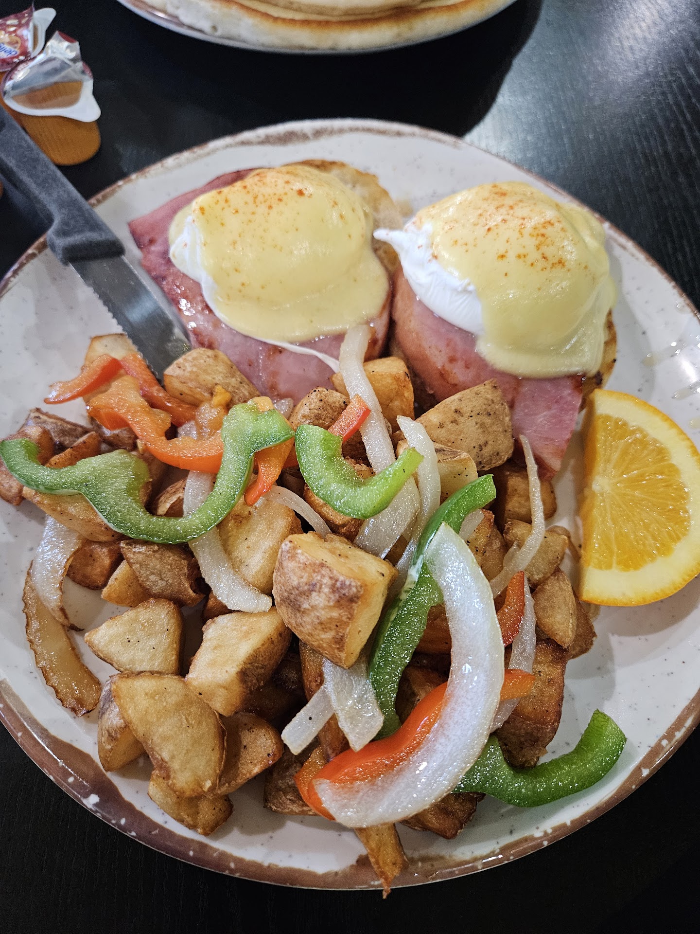 At the cash register, I politely told the person there that our experience /wait was not good, and that we wanted to pay and leave. I said I was not paying for the biscuits or the cup of fruit since we didn’t receive them. She said our waiter was the only one able to price adjust. “She seems very busy…” I said. And then waited 5 mins for her to appear, fruit salad in hand (still no biscuit).