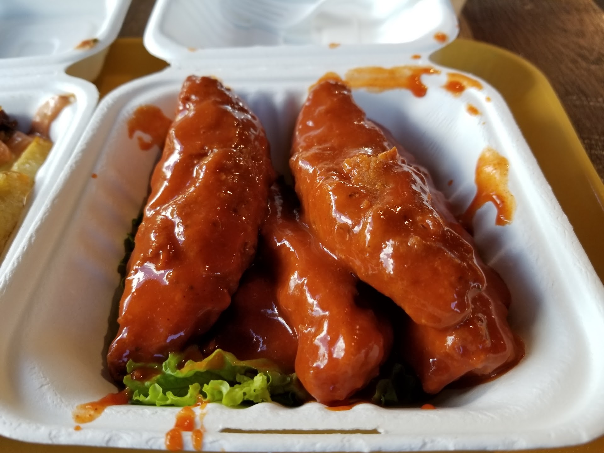 For those who prefer chicken instead of burgers or fries, soy based chicken tenders are available with a range of sauces. The batter is delicious enough that you can eat them without the sauce.