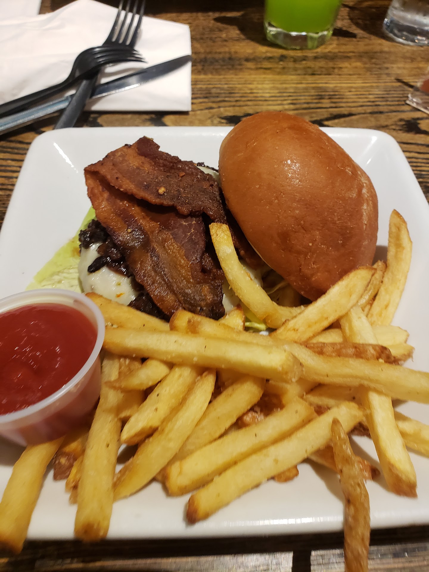 Read moreIts a tad too expensive. Like $15 for a burger and fries. $3 for a drink. Its almost justifiable. I had the "angry drunk burger" or something like that. Thick cut, candied bacon, with goat cheese and a red wine marinated patty. Pretty good.