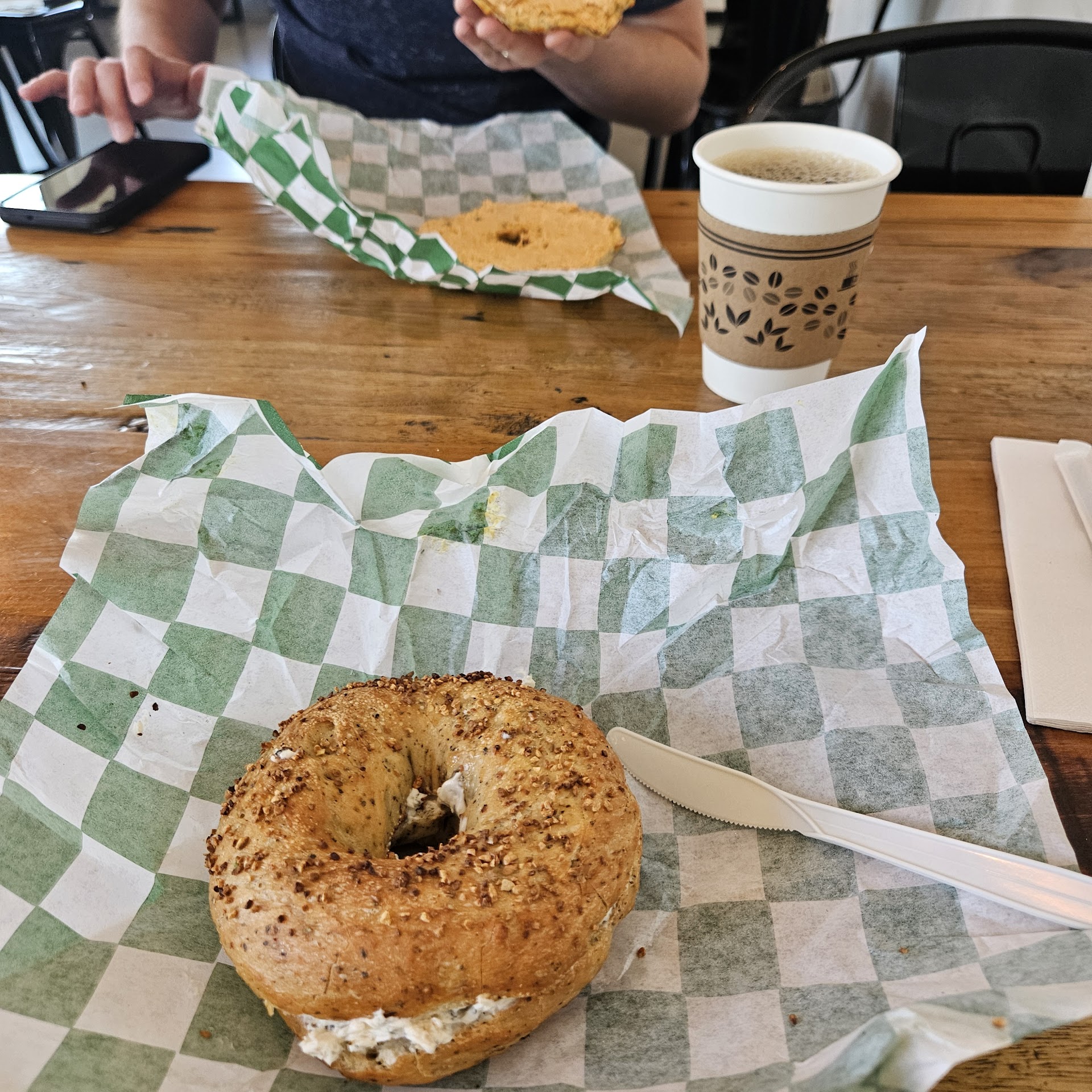 Read moreI loved this place! I was trying to place what was different about the bagels and after reading some of the reviews, I think it might be that they don't boil the bagels before baking, or they at least don't boil as long. This does give them a different texture (not as soft), but I wasn't mad at it! We came back 2 days in a row (visiting from out of town) because I was sad to leave them behind. The first day, I got the garlic and herb bagel with the garlic and herb cream cheese. The girl helping us was really nice and gave her opinions on what she likes as I was debating on cream cheese for my bagel. The second day, I got the bacon and cheddar bagel with the garlic and herb cream cheese. Both days, I was blown away! The flavors are great, and the cream cheese was soooo good. I had the nantucket OJ to drink the first day, which was bleh, so I got apple the next day, and that was a win. We went in on a Saturday morning and a Sunday morning and didn't have a line really or have to wait. Staff was attentive and quick, as well as being friendly! Sad that these aren't out here in Vegas, but if I'm ever back, this will be...