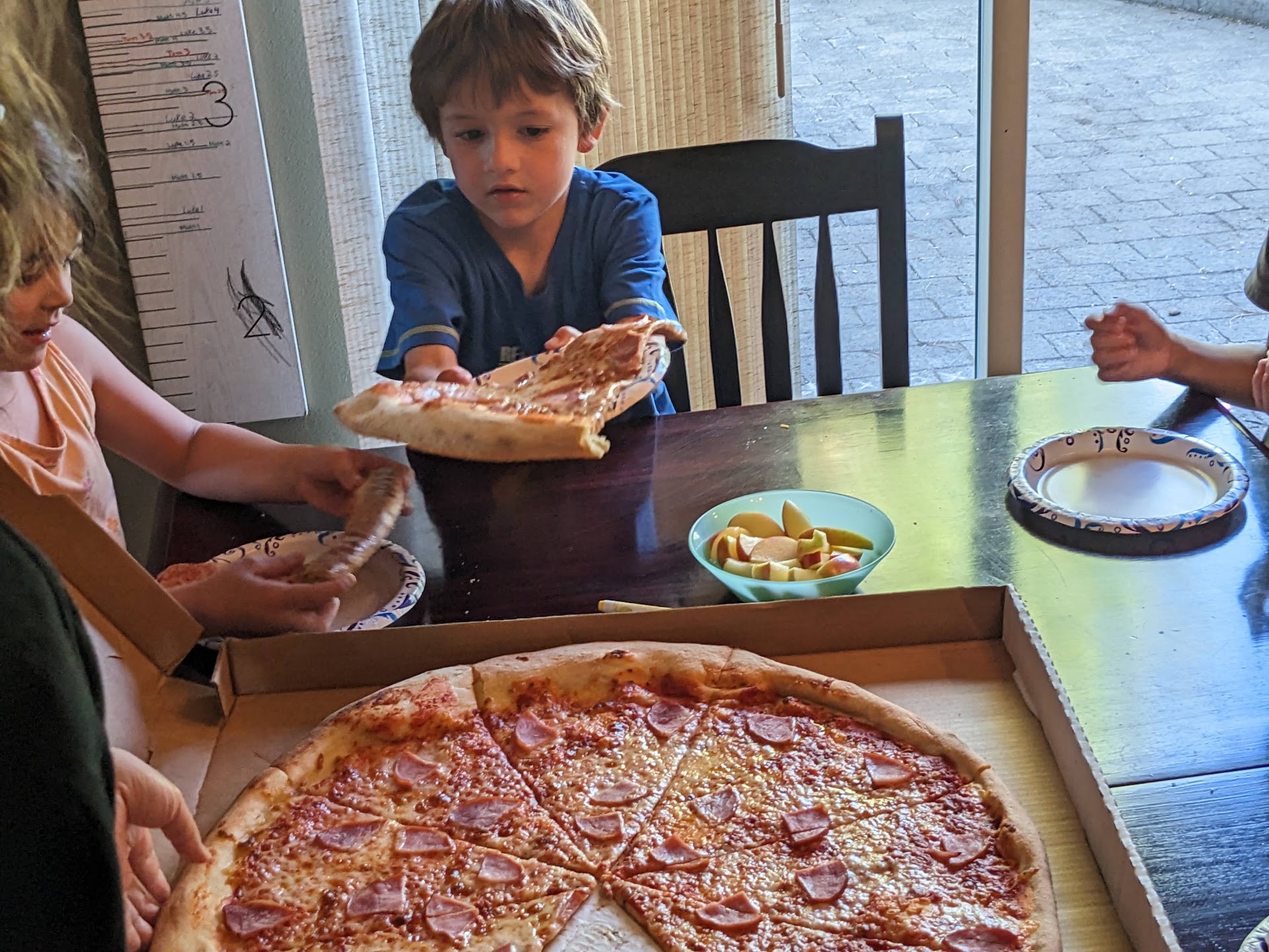 We dug into the pies. Unfortunately, we all had to retreat to the living room to eat, because the pizza took up all of the real estate of our dining room table. Which is, for context, the single largest surface in our home.