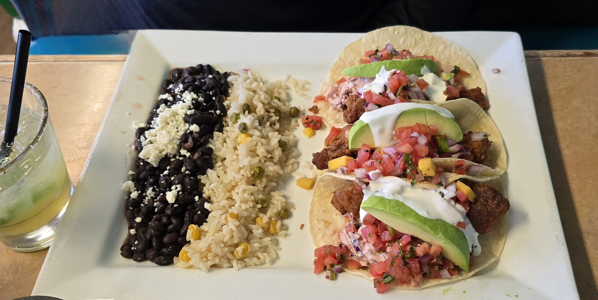I loved this place! Went with my husband for a day out without our kids, and it was perfect. The interior is very cool with cozy and comfortable seating. There's a small area with tables and chairs, an enticing bar, and then a larger area with booths. The aesthetic is colorfulI will definitely return with our kids. The atmosphere was both vibrant and chill, festive, yet relaxed. The gentleman who served us was very friendly, polite, and courteous. We sat outside, which was so nice! There is not a lot of outdoor seating, but it didn't make a difference for us. The cozy patio was comfortable and well-shaded. The salsa and chips were excellent to me, an interesting combo of chips. The menu was really great. I do not eat meat or dairy, but my husband does, and we each found a delicious and filling menu item. I don't remember what he ordered, but I ordered a rice, veggie, bean bowl with sautéed mushrooms, forgive my poor memory on its name, but it was absolutely delicious! I also ordered the vanilla mango mojito, and it was SO GOOD! Our food was cooked up and served very quickly, as were the drinks. All around, I had a great experience and most definitely will return. I wish I could remember the gentleman's name who served us, as he provided...