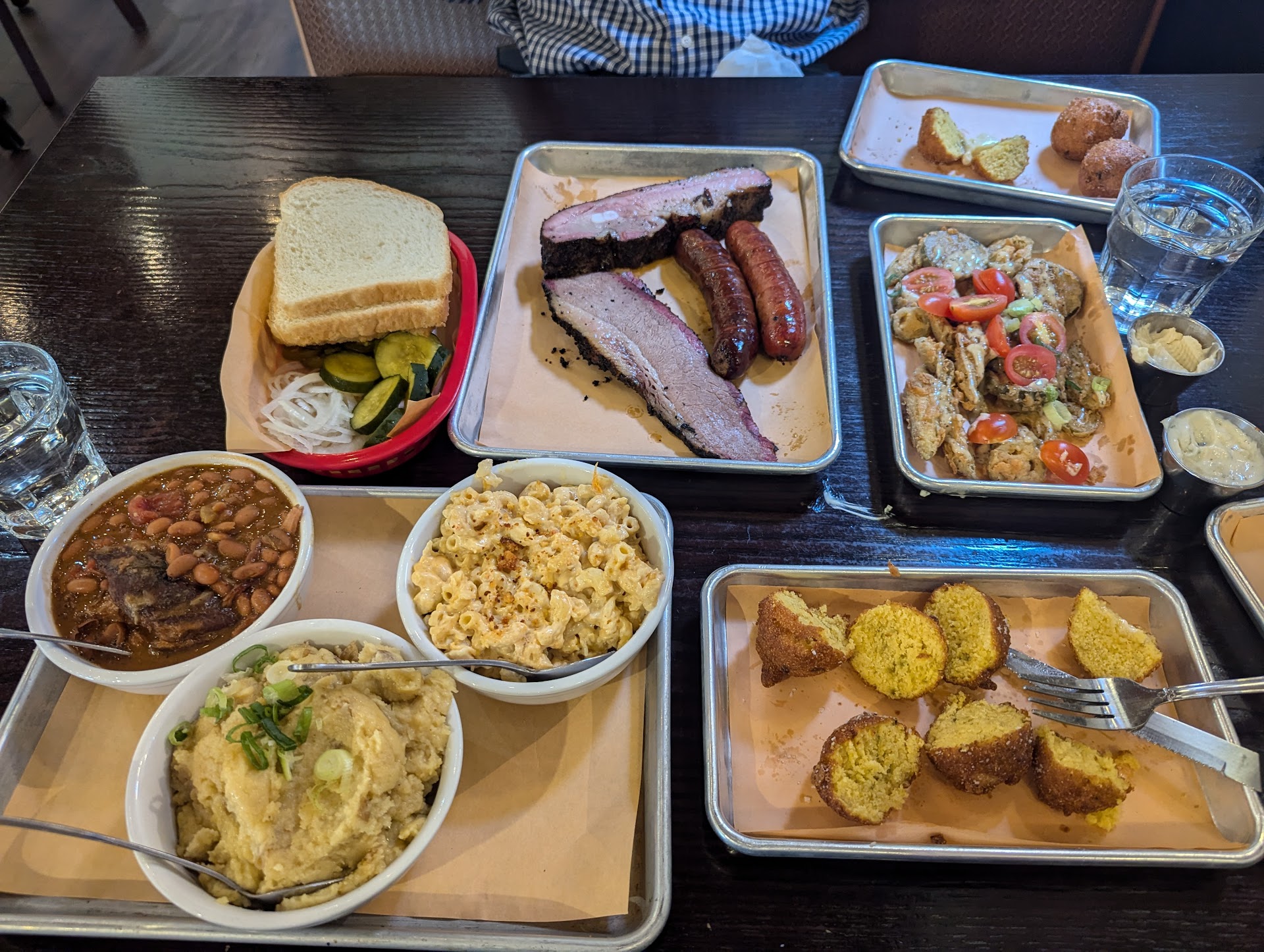 Everything else came out barely warm to the touch and flavorless. We had to ask for salt and pepper to try and salvage our sides. Wish their bbq sauce wasn't basic, to help the meats. The brisket, didn't taste like anything. Not beefy. Just flavorless fatty in texture, tender and juicy, but not a lick of flavor. The ribs had the most flavor, but they were borderline room tem and dry, so that took away from the overall flavor profile. Nothing had a crust or crisp to it. The chicken wasn't dry and was the warmest of everything we ordered. The skin was past rubbery. The sausages were blah. I've had better sausages off food carts in seattle. We dug in the second everything came out and nothing was close to being warm in temperature. It's like if you were served food at a family party where everything was just sitting out.