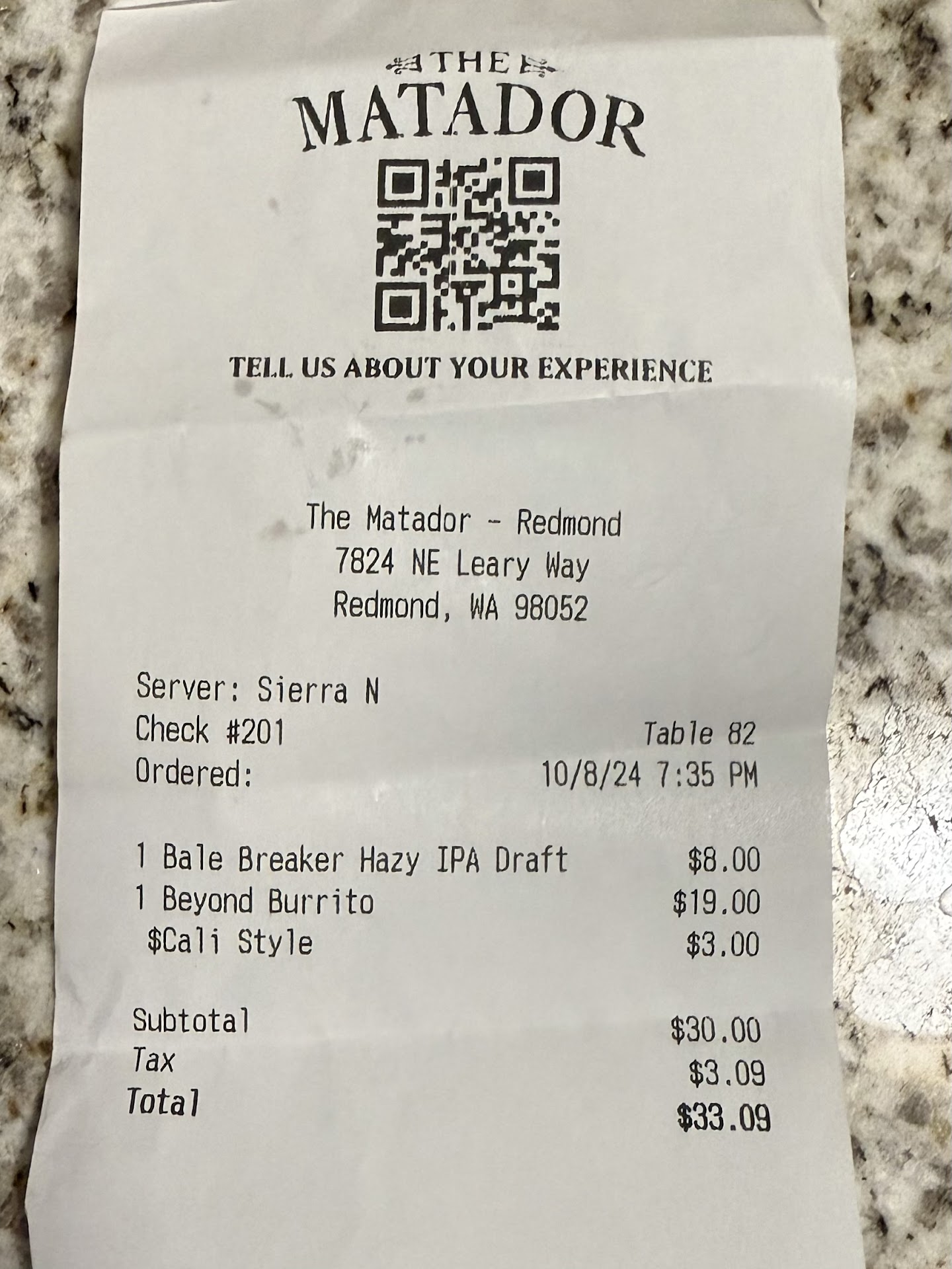 Read moreHaving visited Matador in Redmond on several occasions, I feel compelled to share my invariably positive experiences. This is a place where consistency pairs wonderfully with quality, making it a must-visit location for both locals and travelers alike.