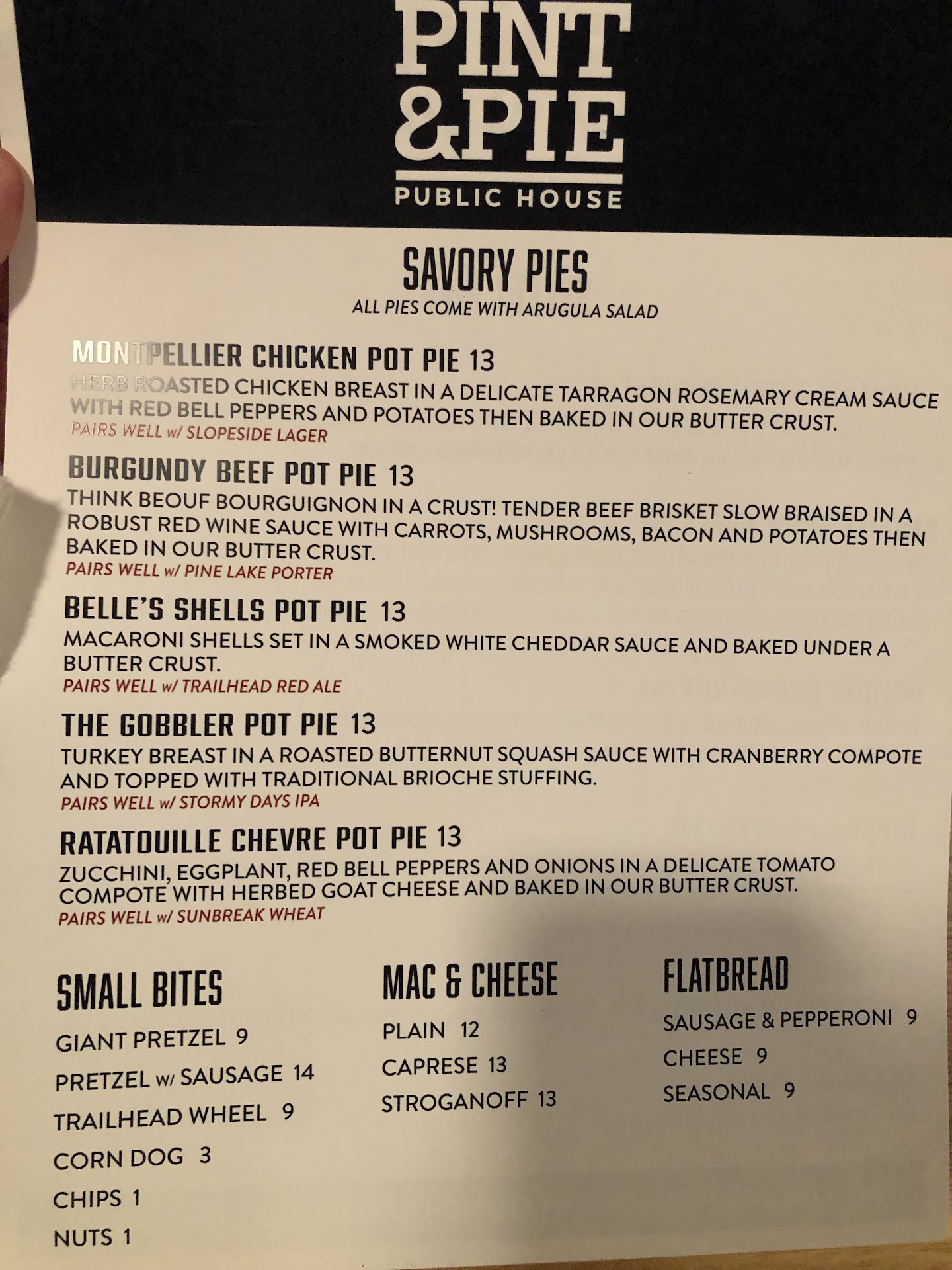 Food: We went as a 6 person party and ordered the below items - (1) Trailhead Wheel: See photo as the menu doesnt describe the item well. (4) Burgundy Beef Pot Pie: Decent flavor but not super memorable. I was a little disappointed the beef was ground beef vs. large chunks that was braised down. Crust was on point though - buttery, flakey, and crisp. (1) Belle's Shells Pot Pie: Decent flavor, disappointed it was just a disc of crust placed on top of the mac and cheese. (1) Ratatouille Chevre Pot Pie: okay rating (1) Chocolate Stout Mousse: Good but doesnt have hints of espresso. It was more like dark and milk chocolate mixed together. (1) Key Lime Pie: One of the better key lime pies but not the best. It had good flavor, not overly sweet but the chantilly cream didnt really do anything for it.
