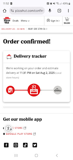 At no point after the initial interaction did I expect my pizza to be hot or even warm. It wasn’t, of course, and it was also chewy and cardboardy. It wasn’t even cut. And my pizza was literally the only one they had on their screen to make.