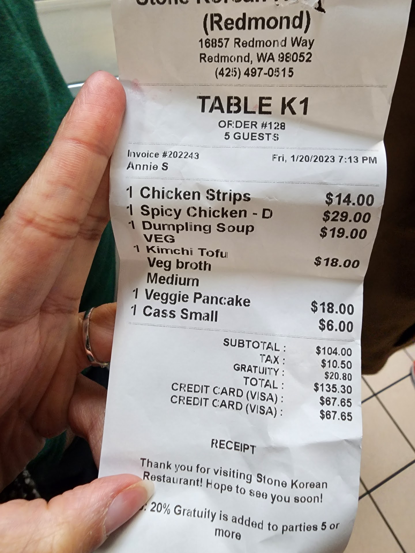 Food: Ordered a seafood pancake, bulgogi and tofu soup. Seafood pancake and bulgogi were average, however, the tofu soup was overcharged for $29 for its portion.