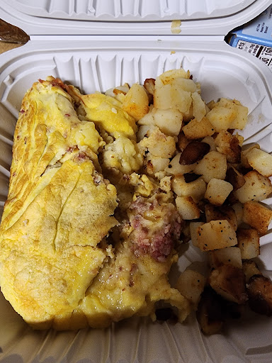The pictures are after I got leftovers home as I didn't remember to take any while there. But one picture is the hash omlette opened up so you could see the "hash" inside it.