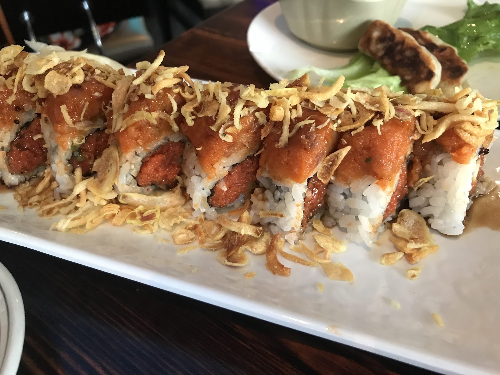Fire Dragon Roll ($13.00): Onion, yellow tail, on top of Spicy Tuna Roll. My fiance especially enjoyed this roll. The onion gives a sutle sweet flavor and the spicy Tuna is a nice contrast.
