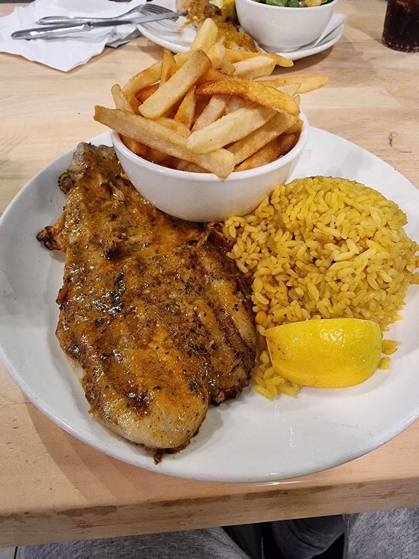 I ordered "From the grill" menu: whitefish with Cajun garlic butter sauce and sides of pilaf rice and french fries. The fish had a very tender and soft texture. The sauce? Let's just say I didn't want to leave a single drop of that sauce on the plate! 😁 The rice 🍚 was also delicious. The only thing I found average was their French fries. 🍟 It wasn't crunchy enough, but hey I didn't come here for their fries. If you still feel like eating dessert after having that entree, then try their creme brulee cheesecake! It is the bomb! 💣 It is not your typical unbearably sweet cheesecake! It was actually sweet but I could still eat the whole cake and didn't feel thirsty (yes, MSG is annoying)! I would go as far as to say if I were to get a cheesecake, I would get it from this restaurant! 👍🏼