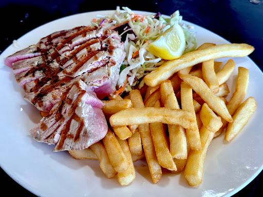 The food is delicious, and the portion sizes are very satisfying. We sampled two menu options: the salmon tacos, featuring corn tortillas, cabbage, cilantro, tomato, red onion, and chipotle dressing, accompanied by black bean salsa and rice pilaf, and the grilled ahi tuna plate, served with french fries and coleslaw. Both dishes were delicious and satisfying, and you have the option to customize them to your liking. Additionally, they offer a nice selection of desserts and beverages.