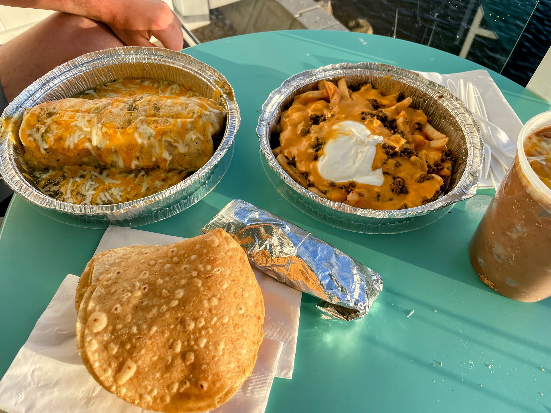 Mexican food in LA is always amazing, and this place was no exception. We ordered our food to go and they had it ready to go quickly. For our appetizer, we got the carne asada fries which were delectable, but came in a huge portion so we had to save it for another day. Our entrees were the steak plate and the california burrito, and we got a side of the 32oz (2 lbs) refried beans. The portions for the entrees were also big, but the food was delicious! We were very happy with both of our meals. The refried beans were divine. However I do have to tell you about a story of what happened with the beans. There I was, eating a full pound of beans in a single sitting, enjoying my life, when disaster struck. After finishing my serving of beans, we were driving in thick LA traffic up north, and I got hit by what I can only describe as a small little man with a sharp knife attempting to kill me from the inside. I could hardly breathe, had to loosen my seat belt, and was just hanging on for dear life. If it weren’t for that 76 gas station along the way, I would’ve just passed away in our rental car. You should definitely try the beans though. Just don’t inhale them too...