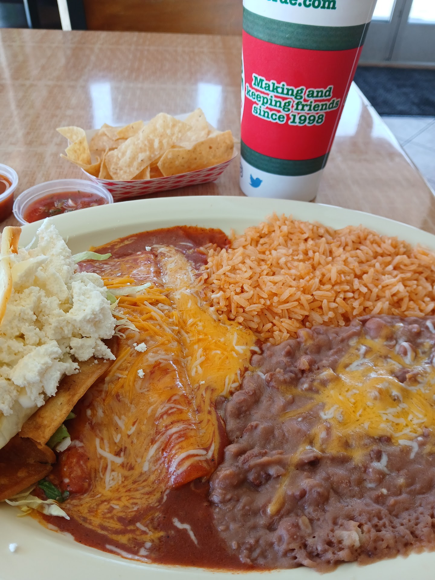 I had been wanting to try this place, since it keeps growing with new locations. Upon entering, I was greeted warmly, and when I asked for recommendations that were without beef or chicken, the service attendant recommended exactly what I enjoy most, which is enchiladas and potato tacos! The potato taco had a lot of queso fresca on top, which I love, but I couldn't really taste the potatoes, they seem to be steamed and not pan fried. The cheese enchiladas were good, but I don't know if it's cinnamon or licorice flavoring in the sauce, but it really care for them too much, and there wasn't really much cheese pull inside. From the salsa bar, the mild salsa has a weird tomato paste flavor, a little too extreme for me. All in all, it was a good lunch, but for them to grow with over 12 locations, is kind of shocking to me. Unless it's the service, which is...