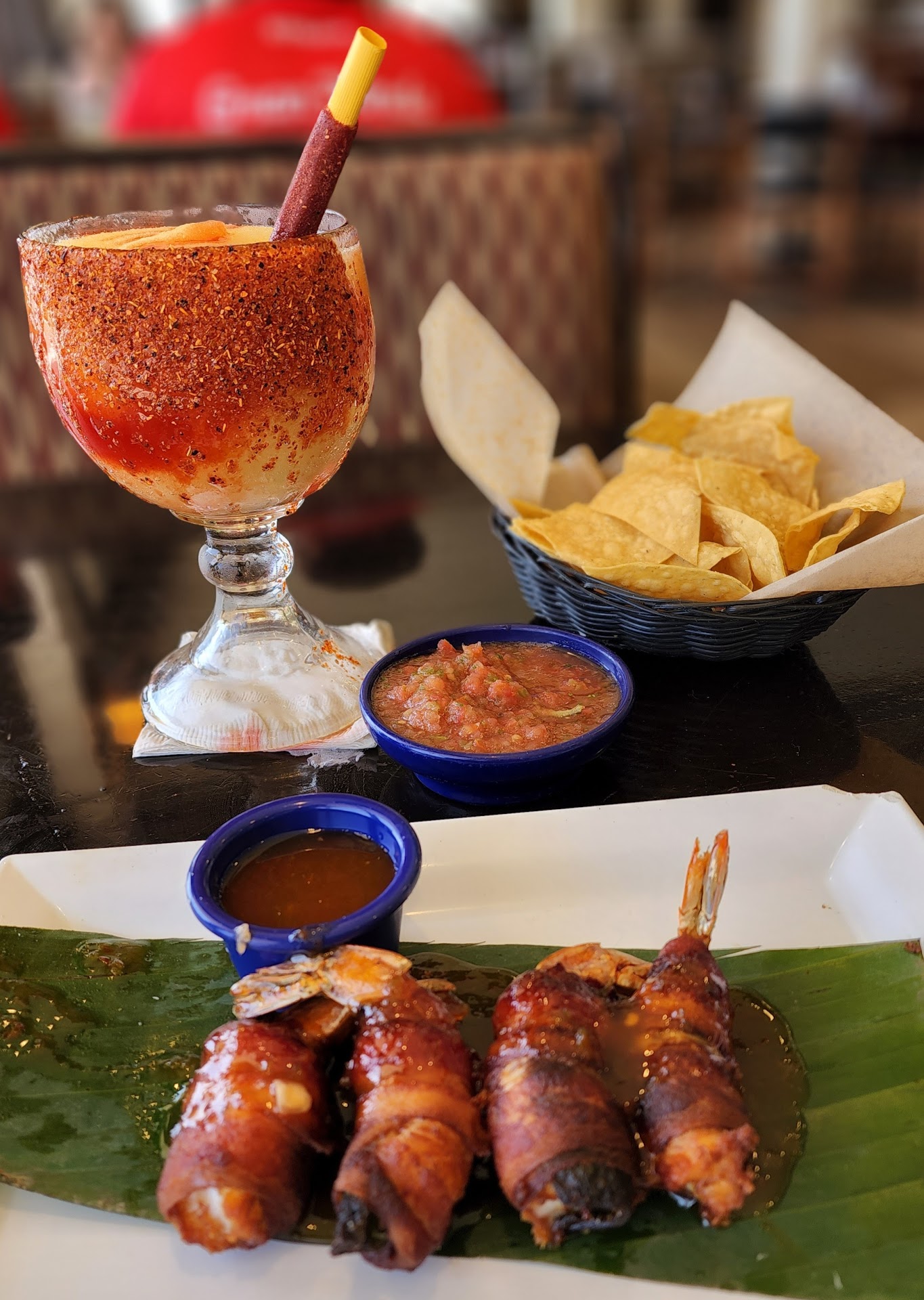 When we tasted the guacamole it was AWFUL!! It was if an entire salt shaker of salt had been mixed in!! Never have we had such absurdly salty guacamole!! We reported this to the waiter at our table and he dismissed it saying he didn't think there was any salt added to the guacamole! No offer to replace. The waiter delivered the bacon wrapped shrimp and vanished! No cutlery or napkins on the table and nobody to ask.