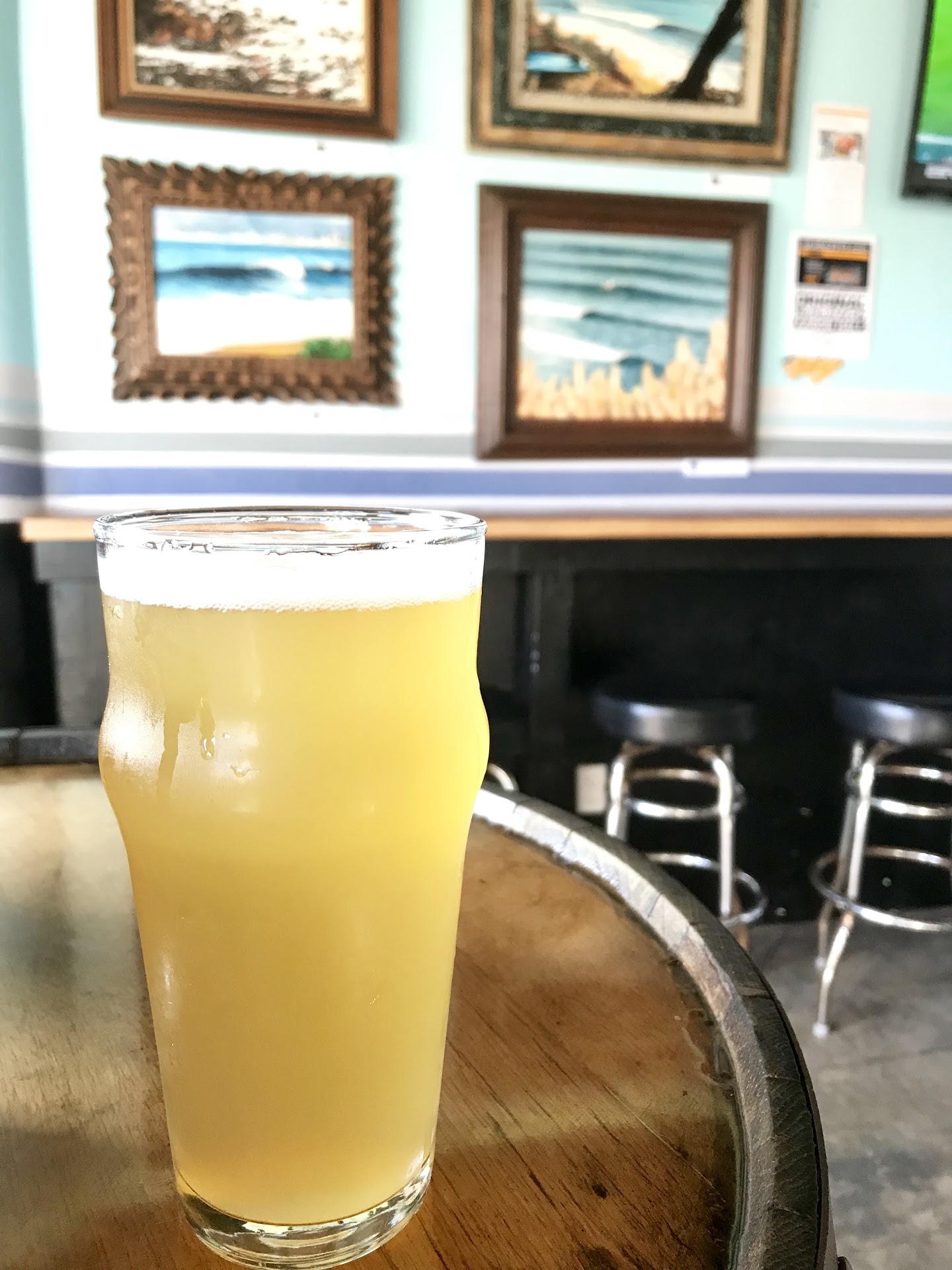 The setting is super laid back, kind of intimate so I can imagine it getting crowded on a summer weekend but perfect for a casual weeknight drink. There are a few stools facing the water but you get the ocean breeze no matter where you are. There's cool ocean-inspired art and the table tops are made from the tops of barrels. Such cool attention to detail.