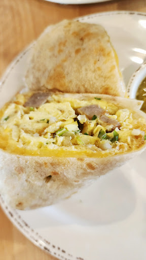 First off, let's talk about the food. We went on a Sunday morning, and everything was delicious. I went for the breakfast burrito, and it was flavorful with bacon, scrambled eggs, cheddar jack, tots, and green onion all wrapped up in a warm flour tortilla.