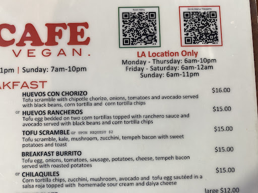 Overall impression was decent setting, and good selection of Vegan food. Ordered the Huevos Con Chorizo, this was the good thing about the visit, very flavorful! Also had a large Americano coffee. While the food was good, the coffee was bland. Wanted to order an orange juice but they only have 16oz size, way too big to go with a meal.