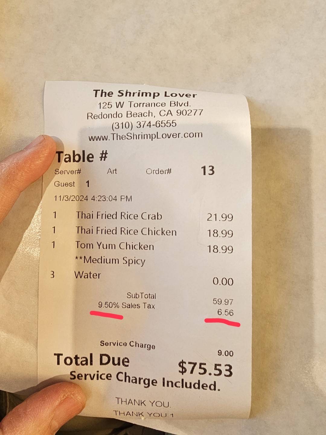 Complicated Payment System: Youâre required to pay before eating, and if you choose to pay with a credit card, thereâs a 3% surcharge (you can avoid it by paying cash). On top of that, dining in adds another surcharge, which was not clearly explained. Despite the local sales tax being 9.5%, they charged us 10.95% (photo attached as proof).