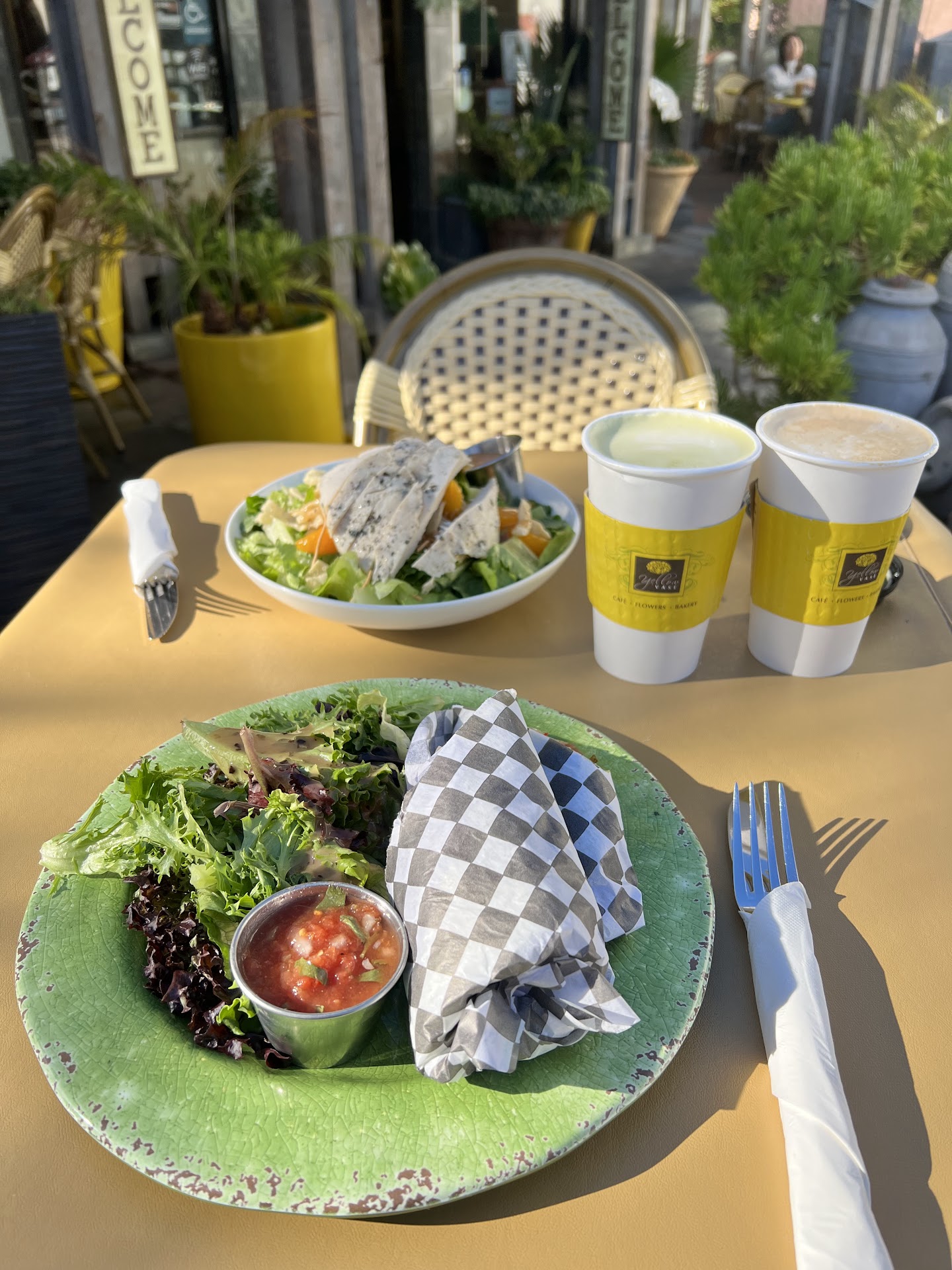 The moment we walked over, everything changed. The village itself is so quaint and charming, with boutique shops, cobblestone-like paths, and a peaceful, beach-town energy. Yellow Vase fit right in, with its bright yellow accents and cheerful decor inviting us in. It felt like the universeâs way of saying, âThis is where you were meant to be.â