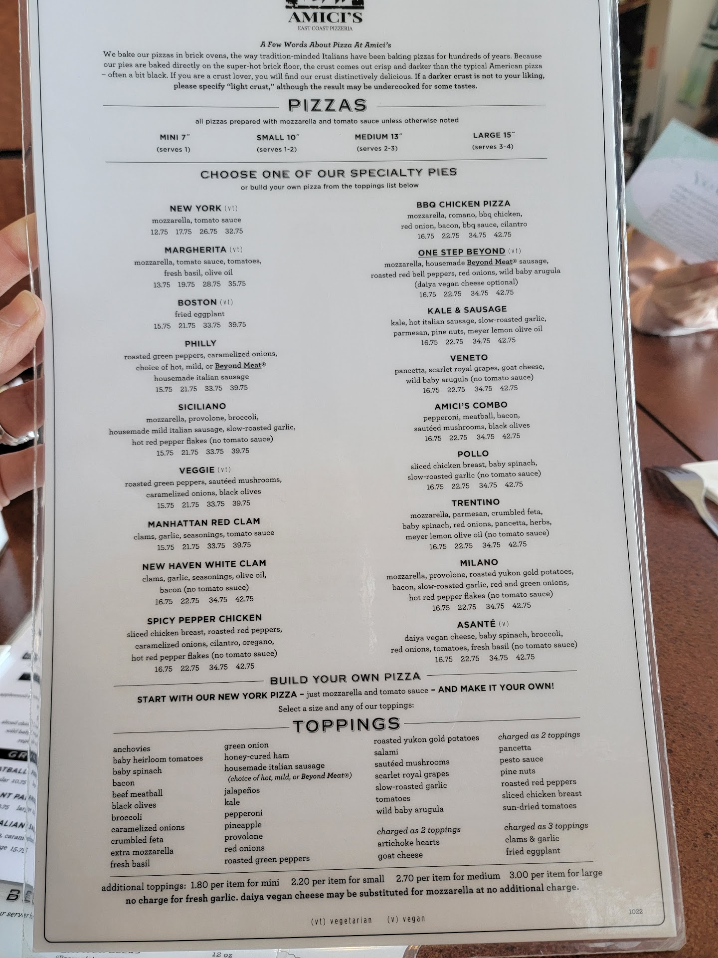 So to sum it all up: Amiciās is the most delicious, high quality East Coast style pizzeriaās but if pizza isnāt what youāre in the mood for just know that they also offer a variety of some truly flavorful and mouth watering Italian dishes and to top it all off their service in my years of experience has always been superb with the staff members being nothing other than always very polite and friendly yet they are also very efficient as well as fast but without ever making you feel rushed or uncomfortable even on their very busy evenings which just makes your visit an overall pleasant one with good vibes and a family friendly atmosphere yet it also makes this restaurant perfect for a variety of different occasions!