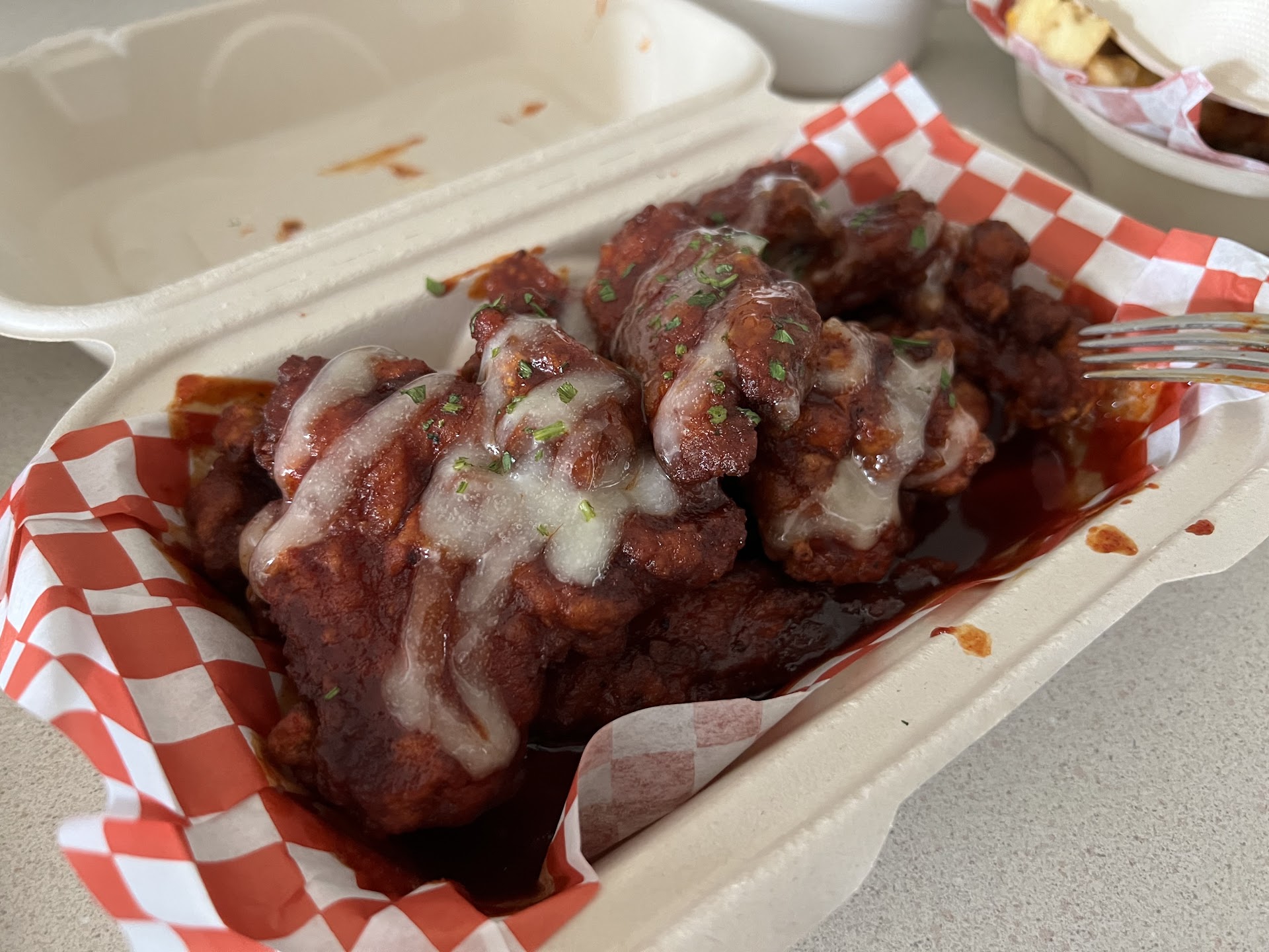 I ordered food for pickup on a Friday evening (~6pm), and the food was ready pretty quickly (15mins). I ordered the Family Bundle (Combo A), which included Korean Fried Chicken with Garlic Soy (10 pieces), Gangjung Fried Chicken with Sweet and Spicy (10 pieces), and an order of Bulgogi Kimbap. I also got the Bulgogi Fries and the Mandu Ganjung with the Garlic Soy glaze.
