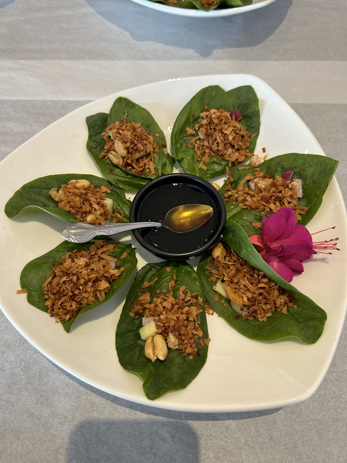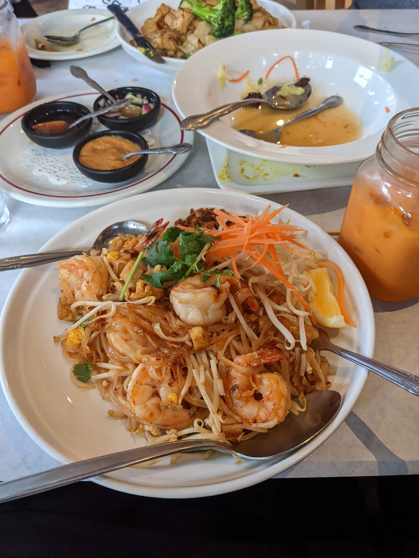 We ordered Thai iced tea, Thai iced green tea (a first for us!), Pad Thai + shrimp, green curry, papaya salad, and appetizer combo platter. The drinks, curry, salad, and combo platter were an absolute 5 stars - get it! The Pad Thai was flavorful - but maybe a bit too much sweet / salty and not enough citrus for me.