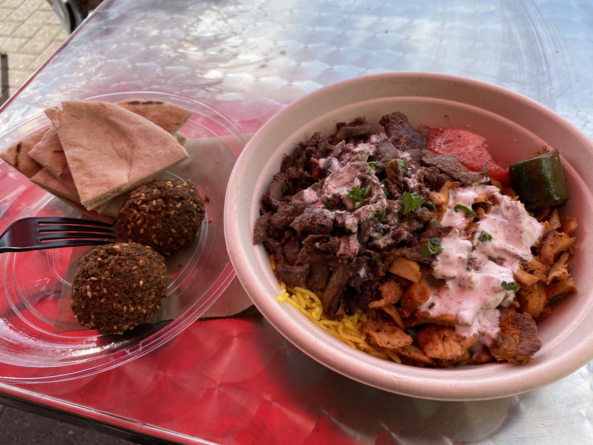 Read moreTried this place for the first time! i have got say i was impressed! They give huge portions at this place i ordered lamb with chicken over rice with a side of salad, love the vinaigrette they put on the salad, & the hummus! is to die for! super good! the guy behind the cash register asked me if i wanted it mild or spicy i said Spicy! they grilled a whole Jalapeño! even though it wasn’t spicy enough for me, the sauces they have which you could get as much as you want made it up! They had a green sauce which i really like, a orange looking sauce, & a red sauce! be super careful with the Red Sauce, its super spicy! i made the mistake of putting too much of it on my plate. I will be definitely coming back to this place for Mediterranean food, whenever i’m craving it! oh they give you a whole pita too! goes really well with the humus they give as a side on your plate! i have gone to Halal Guys & been saying all along thats its the best place for Mediterranean food, i was wrong! This place is my number one...