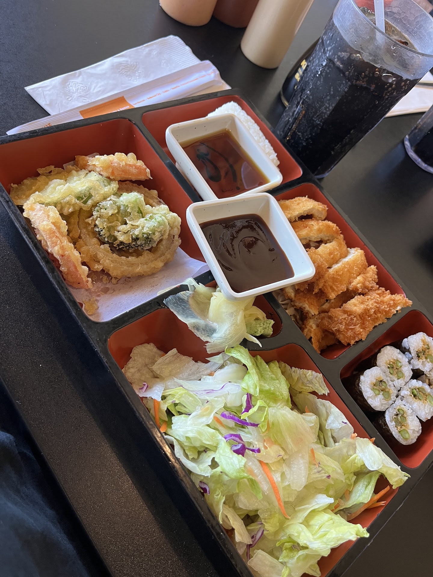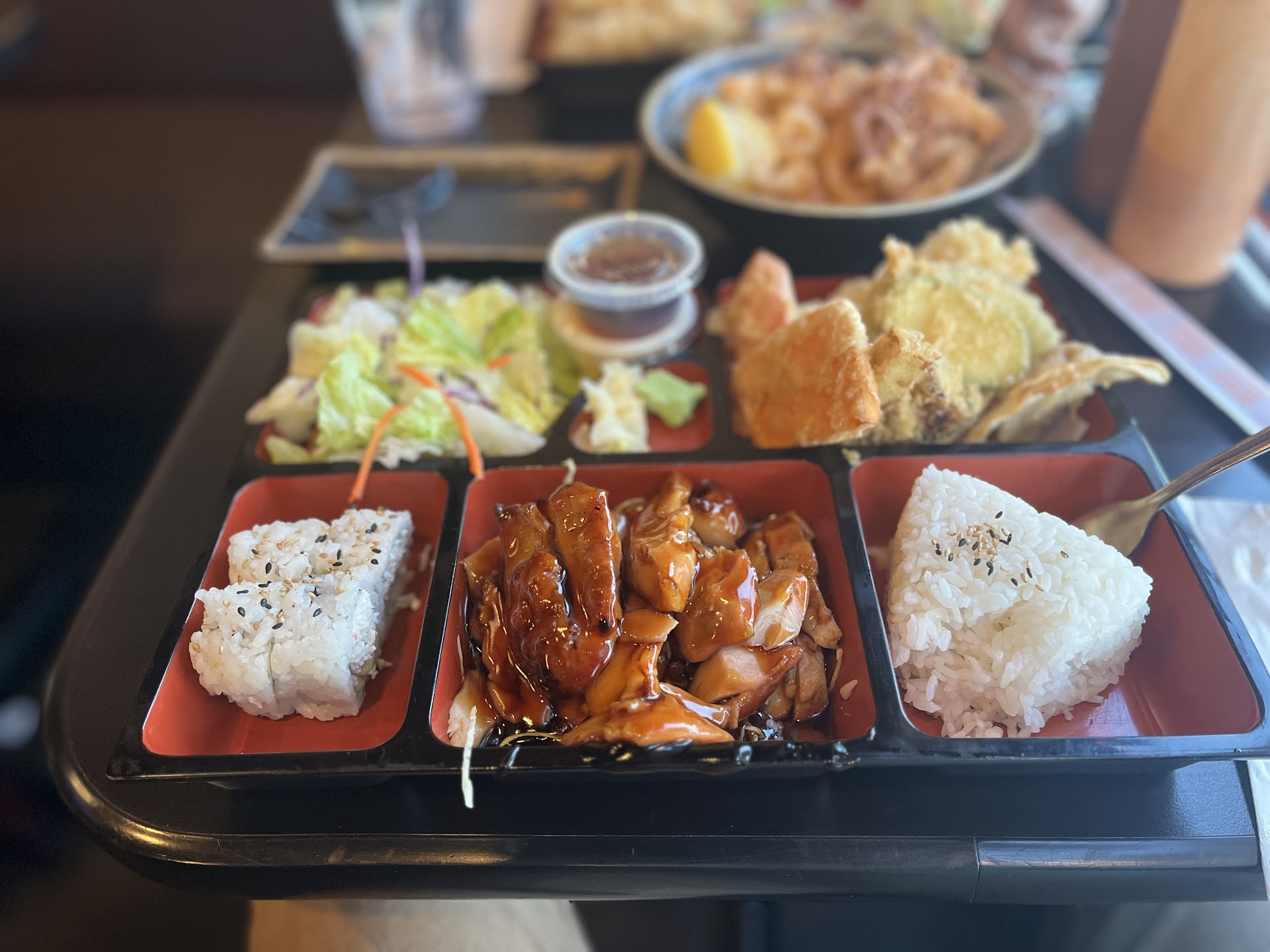 Once we get home I open the bag and find that half of the order is incorrect. We had ordered two lunch bento boxes. My husband's order was correct and included chicken teriyaki, chicken katsu, and an avocado roll. My box which was supposed to include 2 salmon avocado rolls was completely wrong. I ended up with salmon teriyaki somehow.
