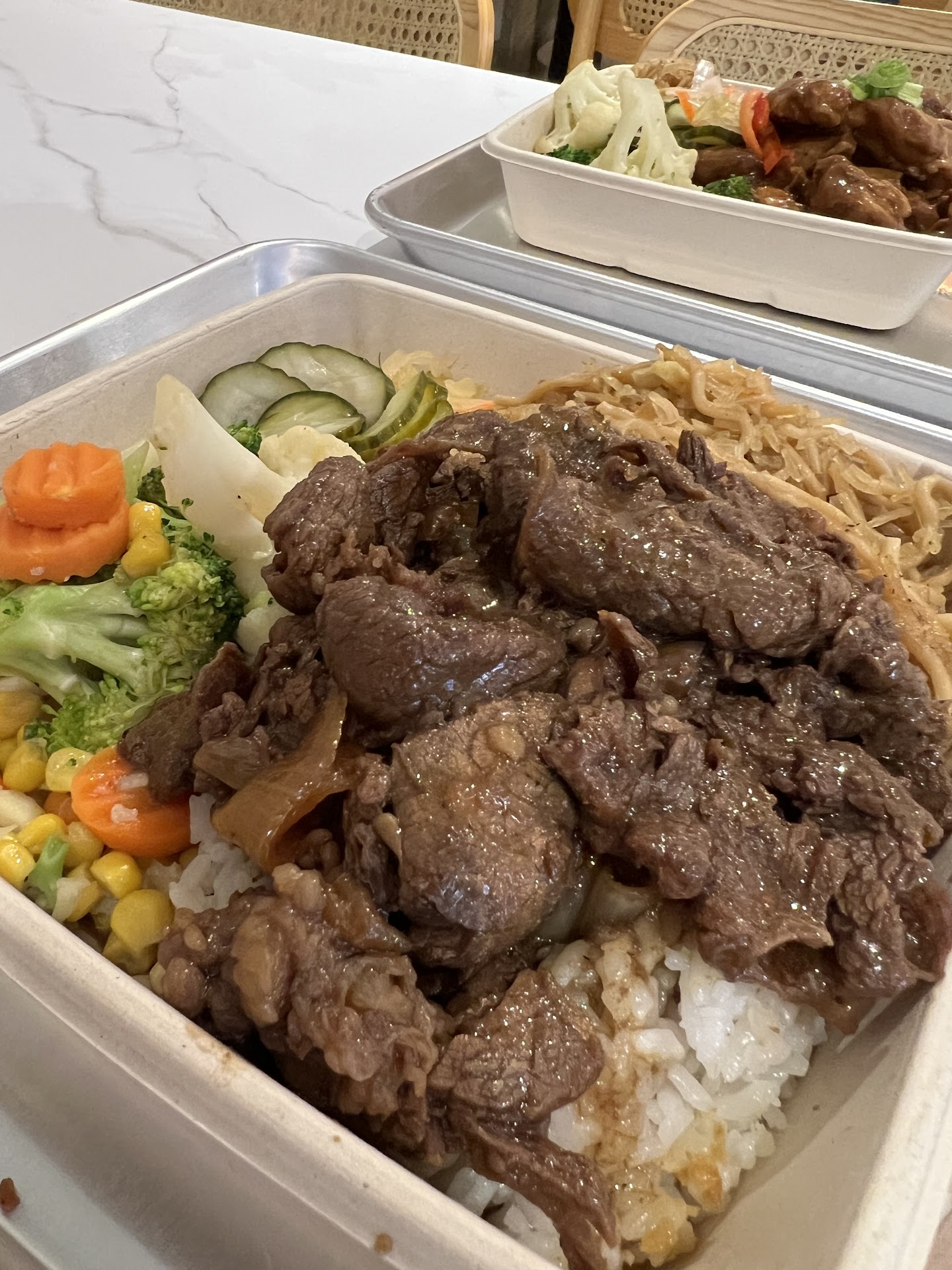 I ate the lumpias with the sweet and sour sauce first and liked that they weren’t greasy at all. The BBQ Manilla chicken was served on sticks (like a kabob) and was fantastic! They sauce we just perfect, they had a nice sear on the outside yet still moist on the inside. Both base choices of the garlic rice and the pancit could have been warmer but I did come at the end of lunchtime so that might have been the issue but they tasted nice and were perfectly cooked. The pickled papaya and the pickled cucumbers were sooooo good and served cold.