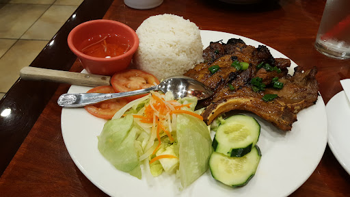 I ordered a rice plate with pork chops, and my partner got a beef pho. One thing about the menu is that many plates come only with the English name, so when I saw chicken on rice I was wondering if it was comga (literally rice-chicken) a dish I enjoy, but the waitress didn't know what comga was. (I don't think they serve comga, the chicken came grilled, she explained, And comga is steamed).