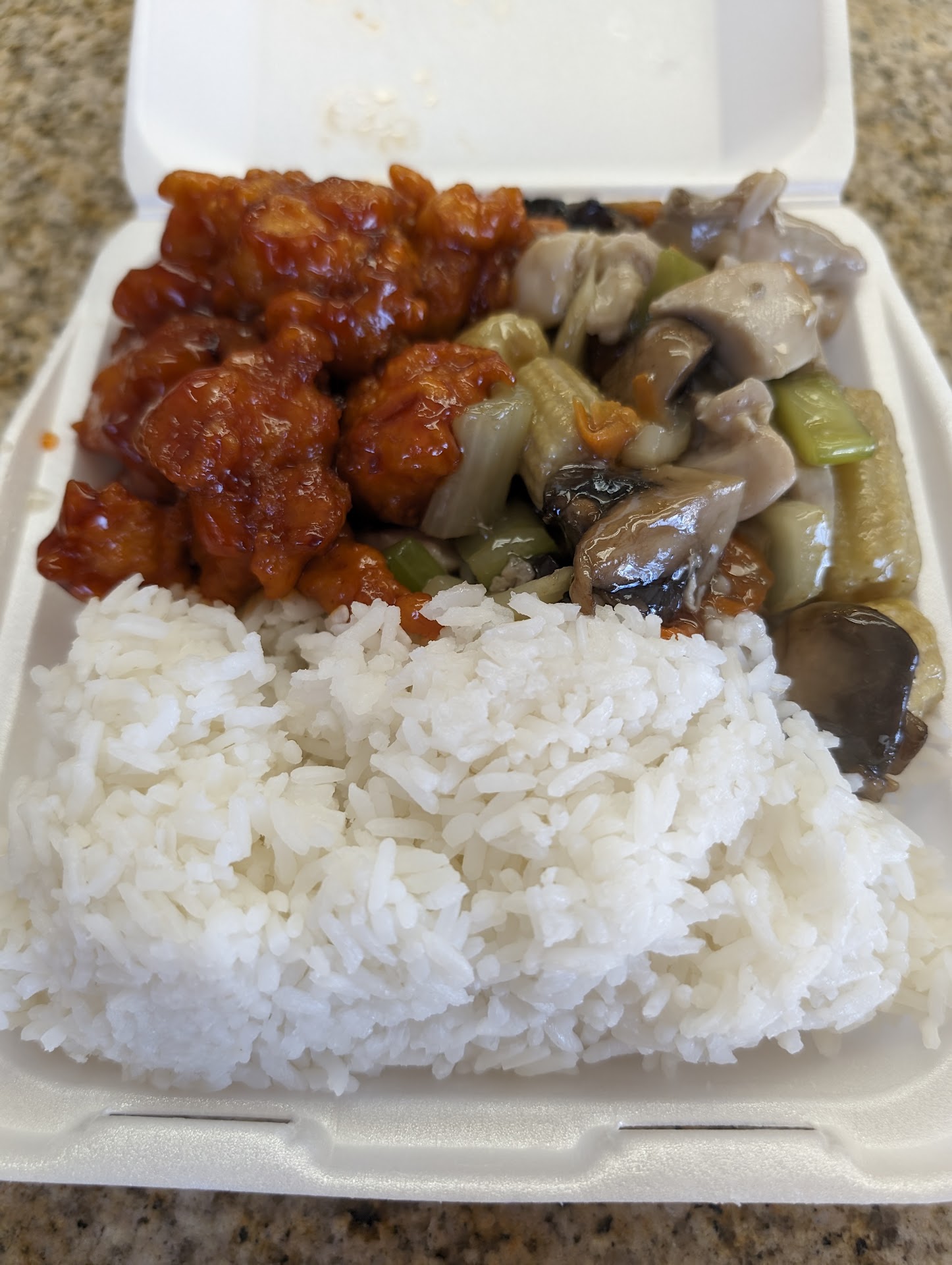 I got. 3 entree lemon chicken curry chicken and a the red pork dish and a diet soda. I paid 11.20 but guess what, the lemon chicken had no chicken in it.... the red pork was 60% bones... and the curry chicken was just alright. For over $11 cash I feel ripped off. Put some damn chicken in your chicken dishes. Stop trying to rip people off with batter. The 3rd entree didn’t even come in a separate container he just put it on top of my rice and it was nothing but bones. 8.59 plus a dollar soda yet I got charged 11.20 for what? Bones and batter? Man come on... save your money and go somewhere else they aren’t putting no damn meat in their food. I recommend going to rickshaw corner in San Mateo. Now they actually give you more food in a 2 entree than this place does in a 3 and it chock full of meat and cheaper! Damn! I was disappointed by this...