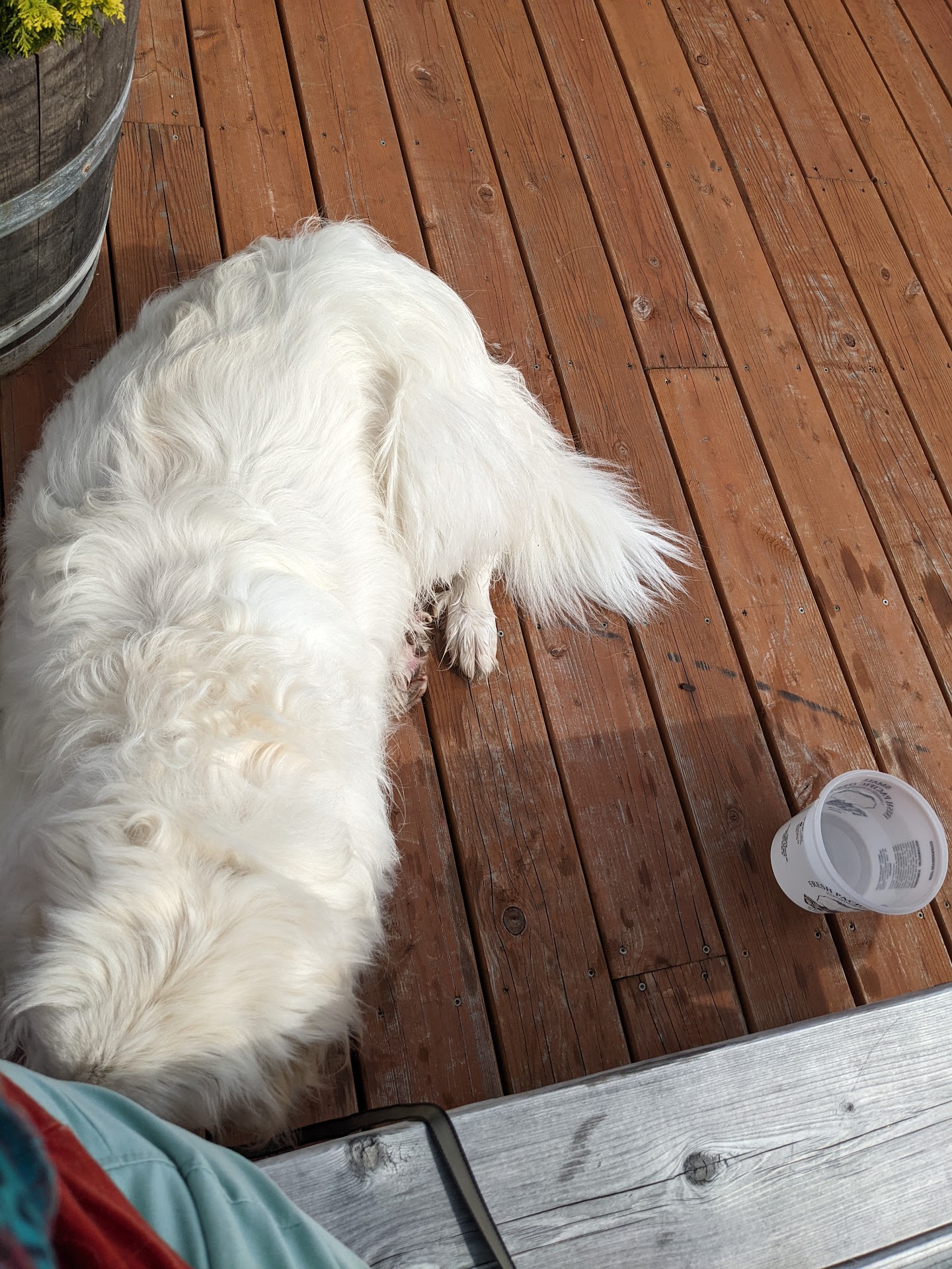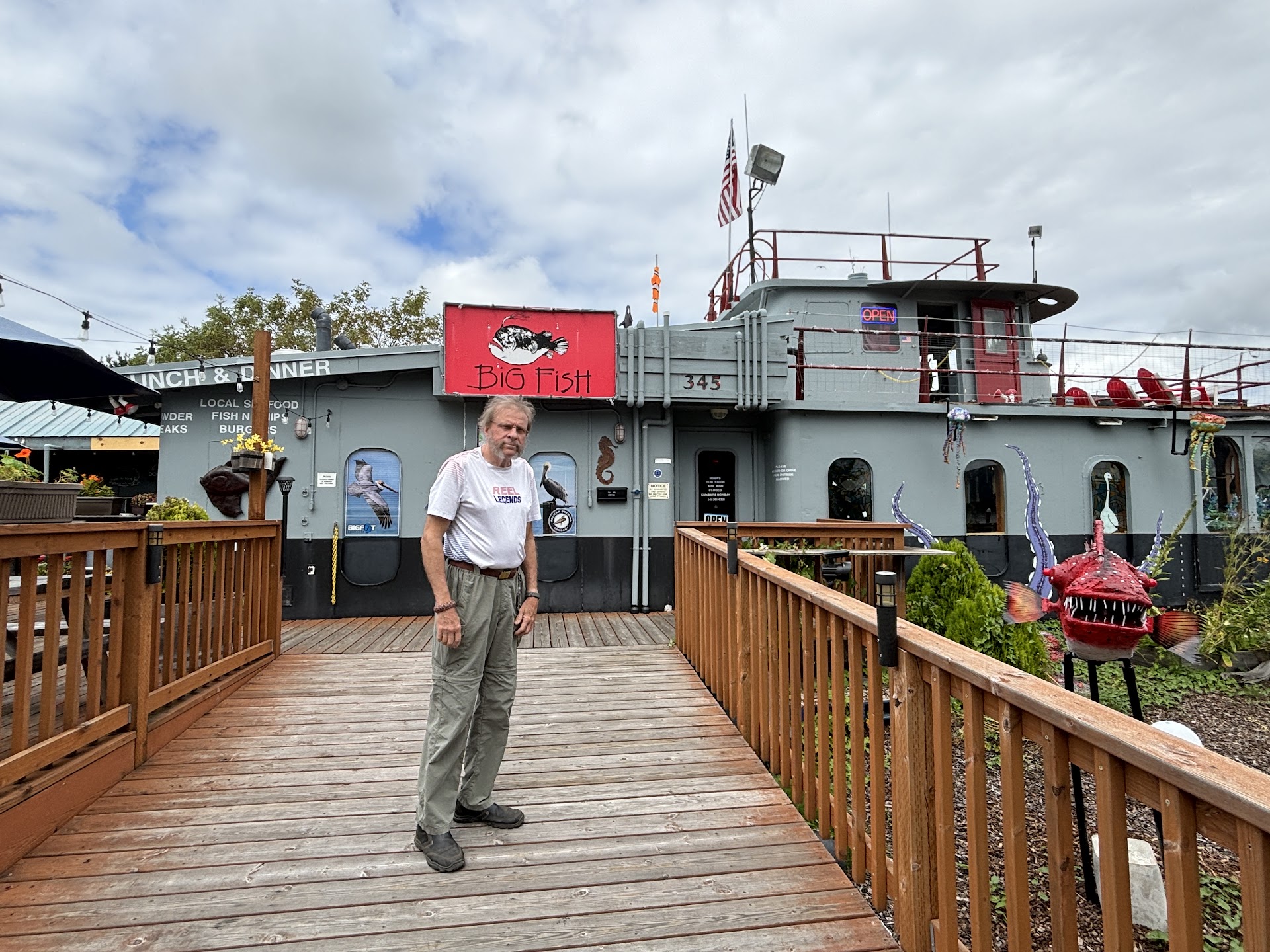 Read moreWalked the dog down to the riverfront to check out the chainsaw competition. Both of us were pretty worn out by the time we got there, so decided to stop at Big Fish, see if they had fish & chips that I've been craving and if they'd let my big girl on the deck while I ate. Very nice server asked the other 2 tables, they said yep, the doggy could join the deck. Ordered the 2 pc halibut fish & chips ($15.75 very reasonable). Also had cod as an option. Server lady brought Daisy a bucket of water and me a glass! Brought a cute little flower pot with fresh bread, half white, half brown, so good!! Food came quick and was perfect! Big pieces, lightly battered, just golden brown, so crispy outside, nice and flaky inside! Also the fries were amazing! Steak size, crispy outside, so soft, like a baked potato inside. Little cup of Cole slaw (with pineapple) nice homemade tarter sauce, and lemon wedge. Very pleased, after finding disappointing, mushy, fishy fish elsewhere, I've found the perfect fish & chips place! Daisy highly recommends the bread and fries! Service was impeccable, everything was clean (think we left some long white hairs behind), ambiance was cute, on the river, definitely will recommend and come back to try other selections. Maybe without Daisy, so I can check...