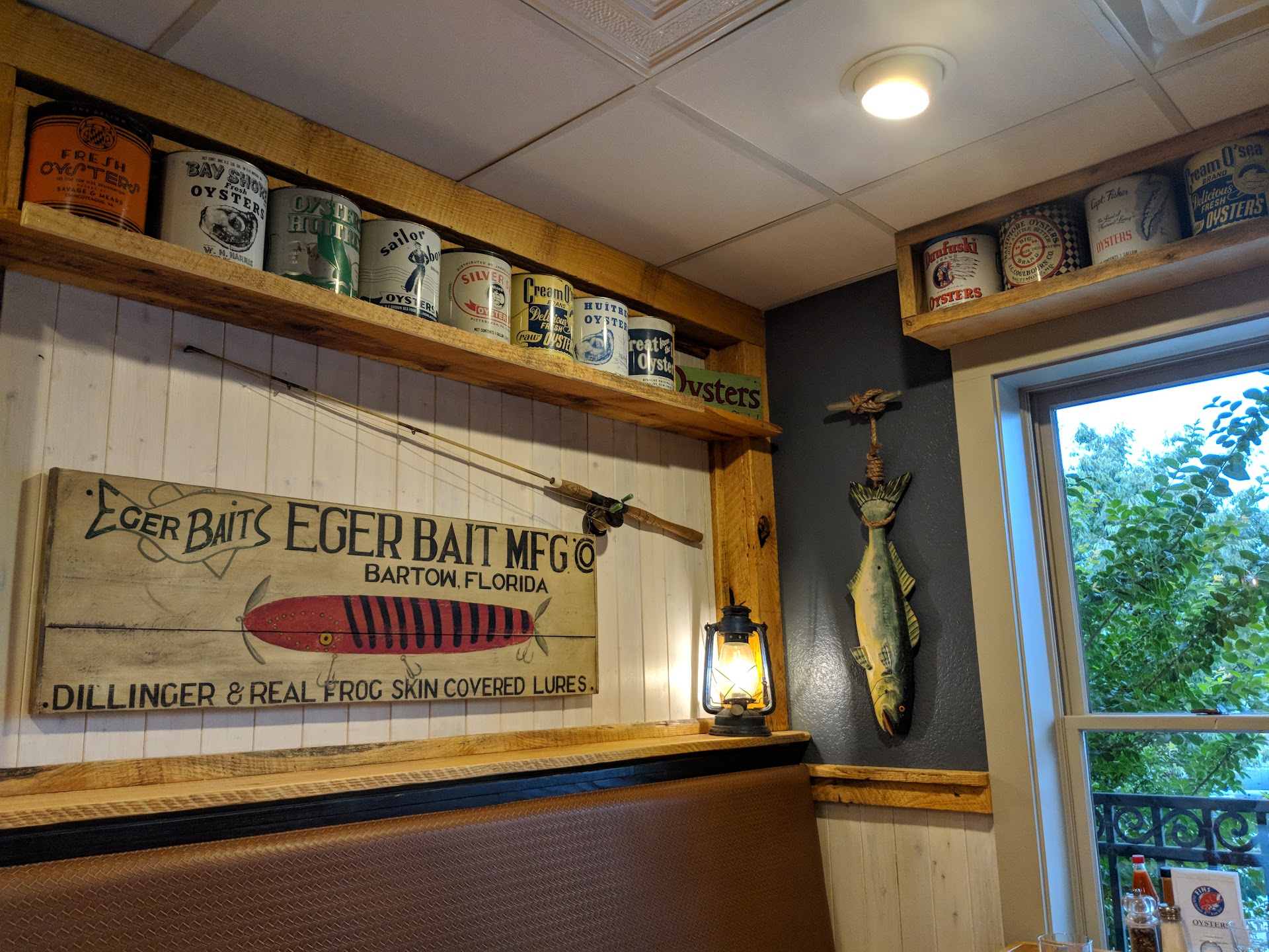 The atmosphere of the restaurant was good. The decor stuck with the oyster and seafood theme. However, the tables were a bit small. My boyfriend, son, and I were sat at a table that had us elbow to elbow. Looking around, all the tables were that size, other than ones pushed together to make tables for larger groups. Would have been nice if they had larger tables. Also, the upstairs bathroom was absolutely disgusting. We had a pretty early lunch, so I’m surprised how dirty it was so early in their operating hours.