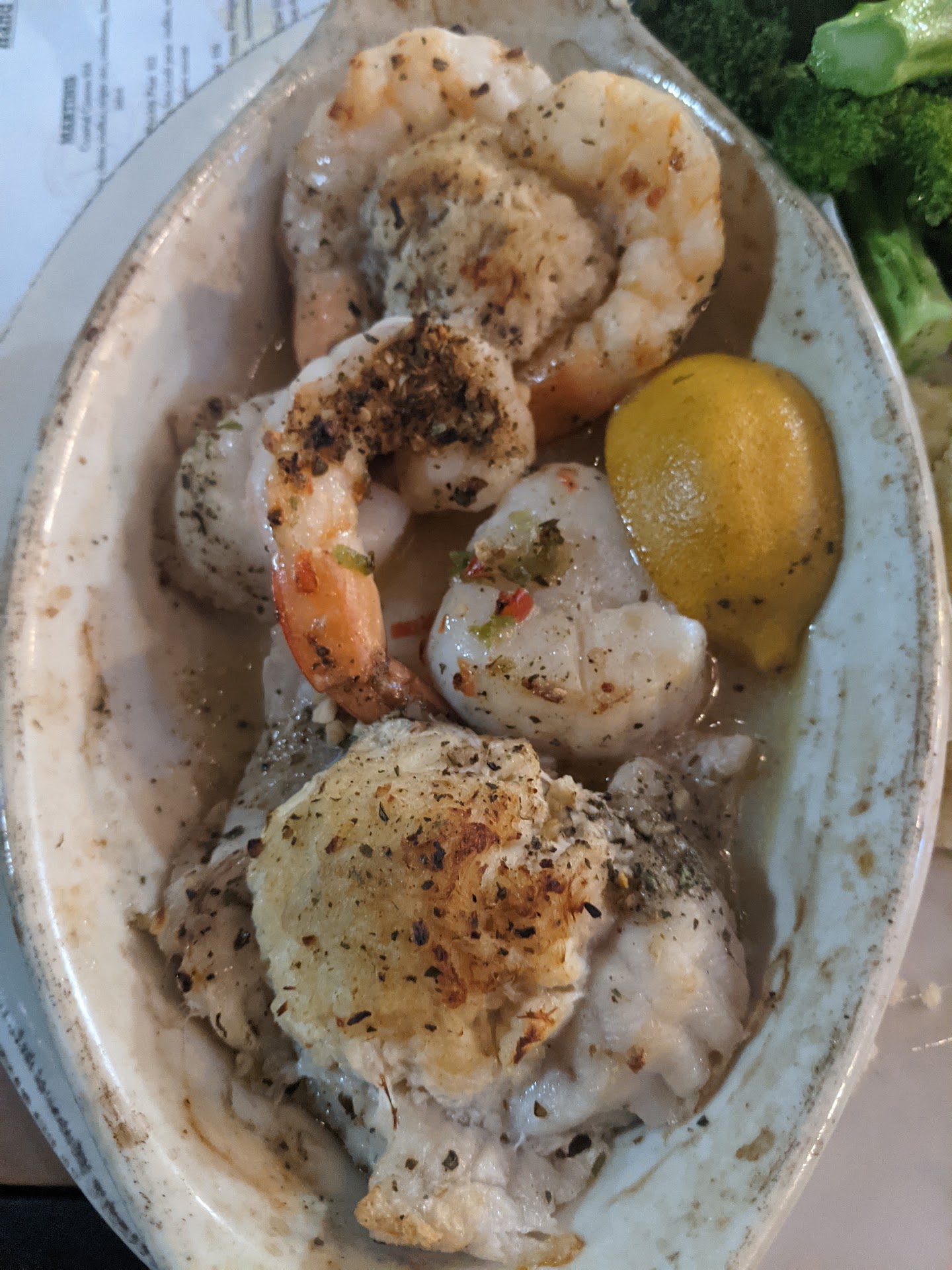 Sunday 9.2.18, party of 3 for afternoon light dinner. Margaritas all around to start. We decided as a group to do it tapas style. We ordered 2 apps and 2 smaller entrees. Stuffed potato skins with seafood, Crab dip with toasted french bread, Shrimp Tacos, and a Lobster Roll. Everything was SUPER fresh and prepared perfectly. Shrimp tacos were served with a black bean and corn salsa and a papaya fruit salsa. We finished the meal sharing a piece of the Raspberry Ombre Cake.. All in with Tip 100. The Meal was SO GOOD, that 2 of us decided to dine here AGAIN on Monday evening, September 3, 2018. Tapas style again, One Margarita, One water. Started with the Fried Calamari with sweet spicy thai dipping sauce, seafood eggrolls and "blackened" Shrimp tacos. We ordered one entree, the Seafood Bake. Again, EVERYTHING was a hit, Calamari was perfectly seasoned and fried to perfection. The seafood eggrolls were huge, deep fried and filled with seafood. The shrimp tacos (2) contained 3 large blackened shrimp per taco over a lightly seasoned slaw again served with Black bean corn salsa and papaya salsa.... YUM!. The entree was baked seafood. 4 large shrimp, 4 large scallops, Filet topped with a small crab cake, (perfectly prepared)served with 2 side (shoestring potatoes and Coleslaw). Again, FINS for the WIN!!! All in including tip 97.00. Fresh and well prepared seafood without pretense. This place...