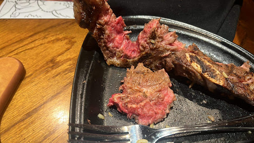 Kyle, our nice waiter was very personable & got us going with drinks and the for mentioned blooming onion. He made recommendations on mains: I ordered the 16 oz OB style Prime Rib & she got the Ribeye w/ loaded baked potato with a fancy salad. Service was swift with food delivery and our only nits were once the mains dropped, Kyle was missing in action; I hoped to show him the required med rare was lacking in redness. Silly me, I know the deal if the meat isn’t right, you’d better speak up fast or nothings going to happen. I also know when staff is avoiding me thus I should have taken a walk to find someone but darn I hate that and next thing you know she is done eating & you haven’t even started cause you’re waiting for another steak and you wonder about ticking off the chef…& I was hungry so I just went on and ate my freaking dinner but when Kyle reappeared I couldn’t help but point out my half eaten situation. I didn’t ask for another steak or compensation just wanted the kitchen to know they might want to keep a closer eye on stuff. Kyle indicated things could be done and he would send his manager over. Deep sigh. I’m regretting any time I’ve had to have a conversation with a suit in a steakhouse but… well this was an Outback…