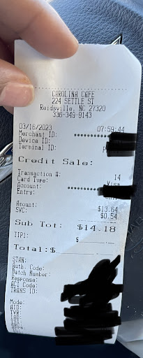 Read moreI use to love the breakfast there but now its all the sudden changed??? Usually they would be full of regular costumers like they had been since I could remember! Though I noticed this morning that they where empty of customers! Then I got my coffee and when I pored sugar in it the top came off the sugar container and filled my cup and shot coffee all over my pants! Told waitress and coffee was not even replaced! Then when food arrived it was not even good at all??? Not close to what they where! Waitress seemed to have an attitude when ask for anything! Even the tea was watered down to the point i thought they had given me water by mistake!!! Sorry but its lost its appeal completely! Think the end of breakfast for me at Carolina...