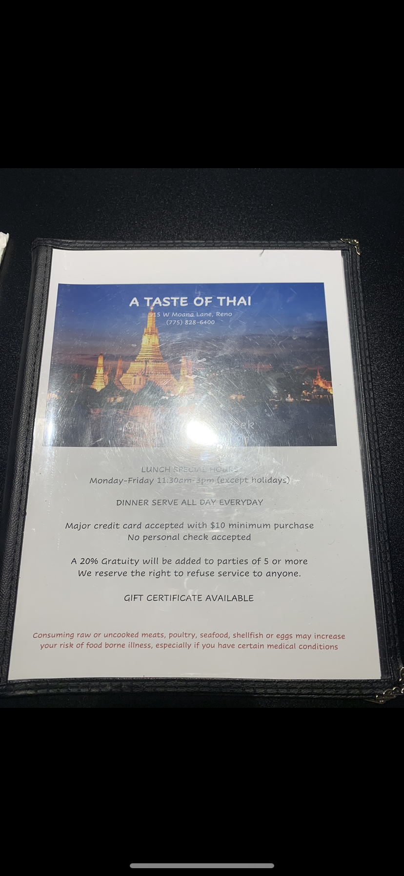 Read moreI had a great experience here. Recently back from Thailand in search of which local restaurant is putting out authentic Thai food.I always order the basics on my first try of a new restaurant. I have to say, A Taste of Thai did a really good job in my opinion. The in-house made rolls were fresh and perfectly cooked. The green curry with chicken was super tasty and the heat was perfect for me. I ordered the 4 of 5 for their heat scale and found that to be a really nice heat…didn’t blow out my tastebuds and allowed me to enjoy the entire meal. The service was quick enough and the server was very pleasant. The price was what you should reasonably expect considering the current economic conditions and I always enjoy a beer or two with a meal....