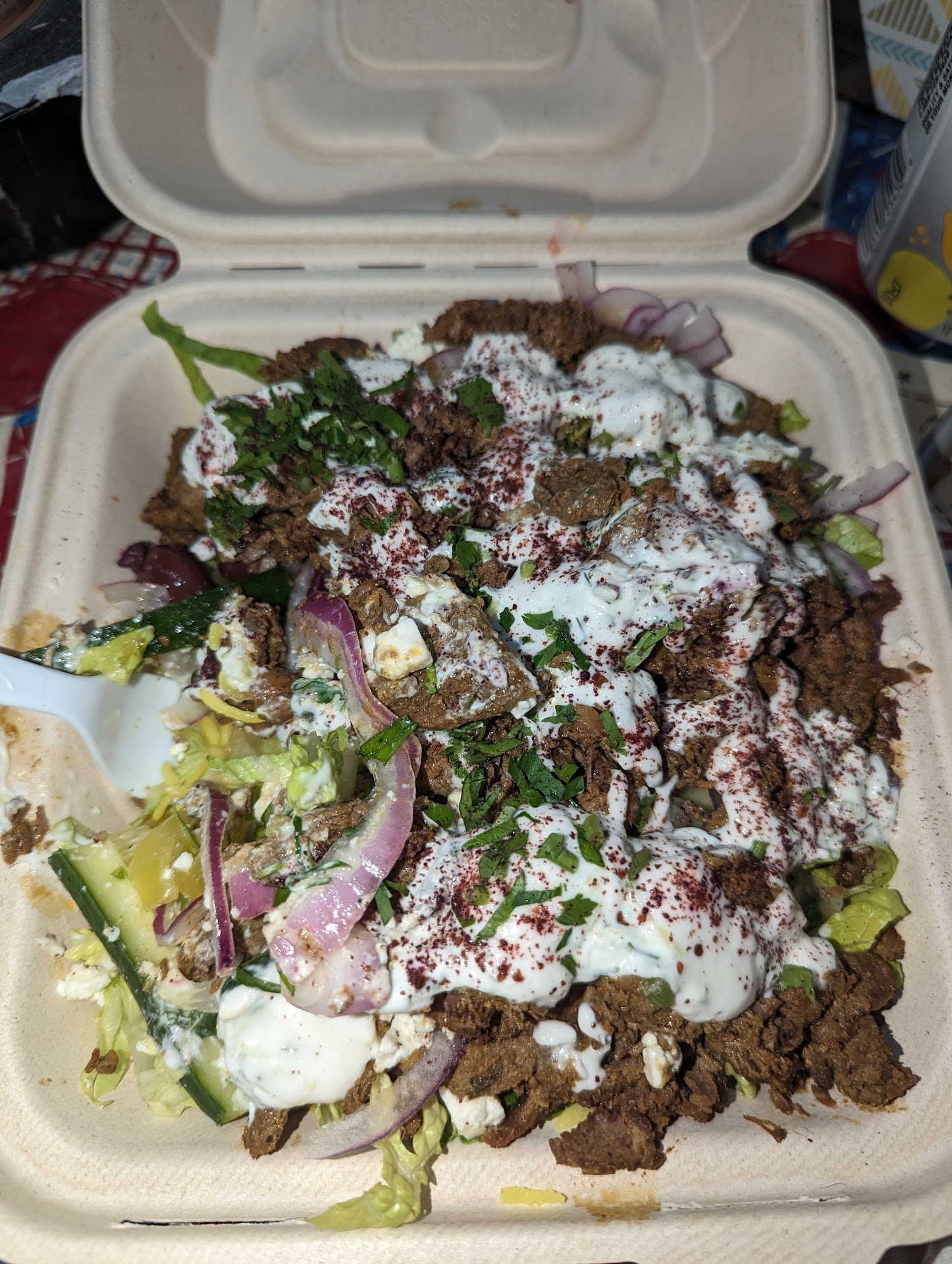 I've been there twice in one week and for the value, I'll likely go again within the next week. I had never had shawarma until coming here. I ordered the basmati rice base with beef the first time and half beef half falafel the second. Got all the veggies, minus jalapeños. Tzatziki and/or tahini with the garlic sauce and even a bit of their house spicy red sauce were choices I tried. No matter the combo I tried, it was nothing short of amazing and incredibly filling. As for the market, it's limited in space and its international inventory but packs a punch in certain areas. I did notice a couple of things that can be picked up at certain discount stores with a large mark-up but that's irrelevant. I purchased a bag of Italian produced Cappuccino wafer bites which were amazing as well. There are a pair of couple-sized dining tables but unless you like the heat, it's not exactly the best place to dine but an excellent place to take-out order food from with really good prices and copious ingredients (although they could drop another falafel or two in the order). There is a cold holding area for their fresh baklava that I still have yet to try.