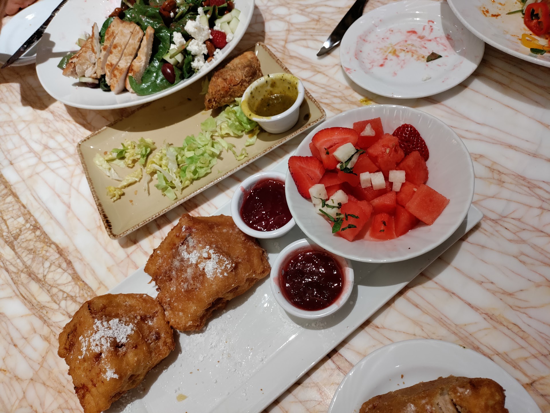We ordered [1] Avocado Egg Rolls $19 appetizer [2] Wood-Grilled Salmon $36 [3] Wine Country Salad $24 and the [4] Monte Cristo $19.5.
