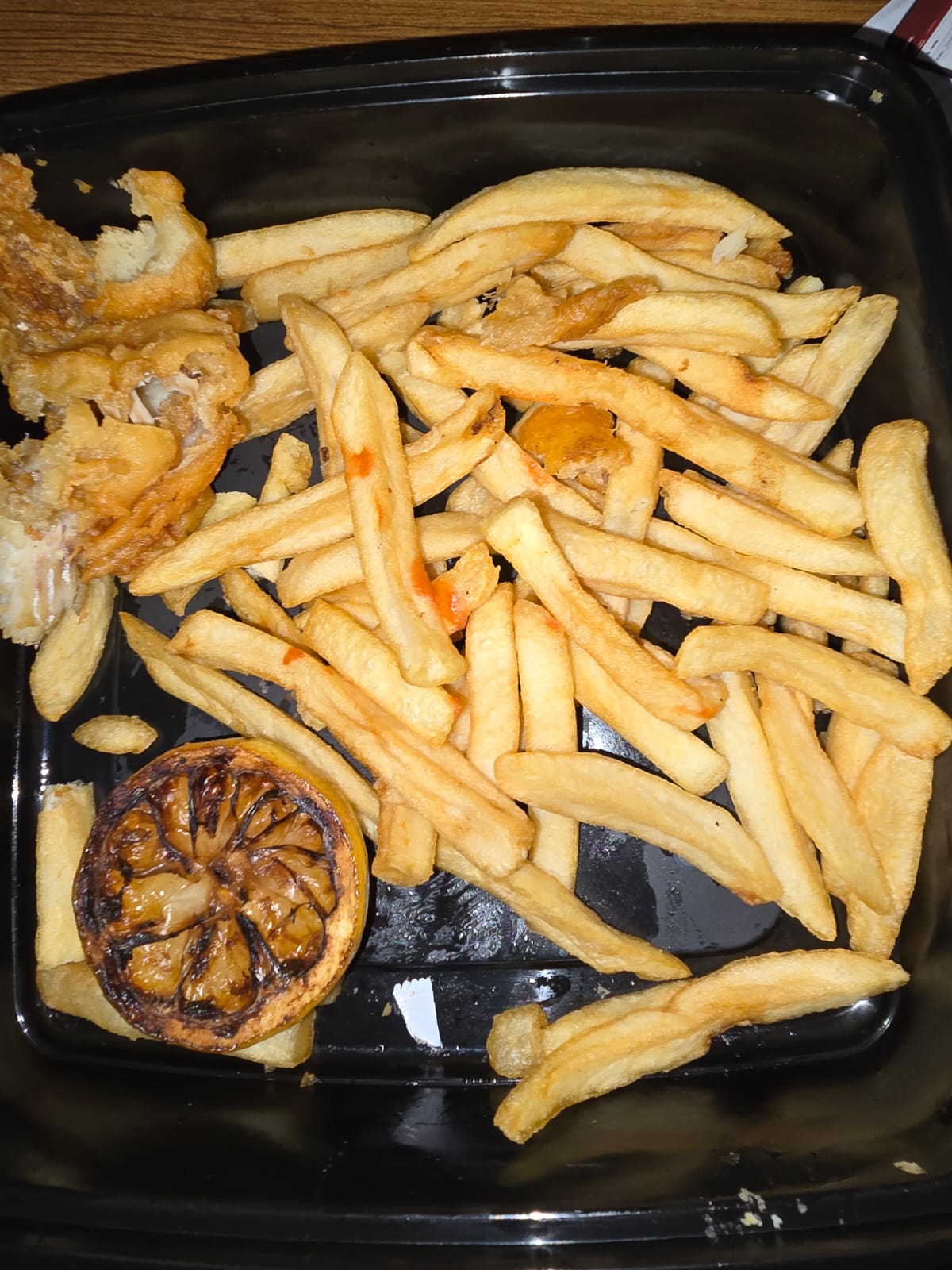 We ordered takeout: tacos for my wife, fish and chips for myself, and a burger for our son. Fifteen minutes later, only the burger was ready. When we inquired about the rest of the food, we were told it was on its way. After another ten minutes, the rest of the order was handed to us by a helpful young lady.