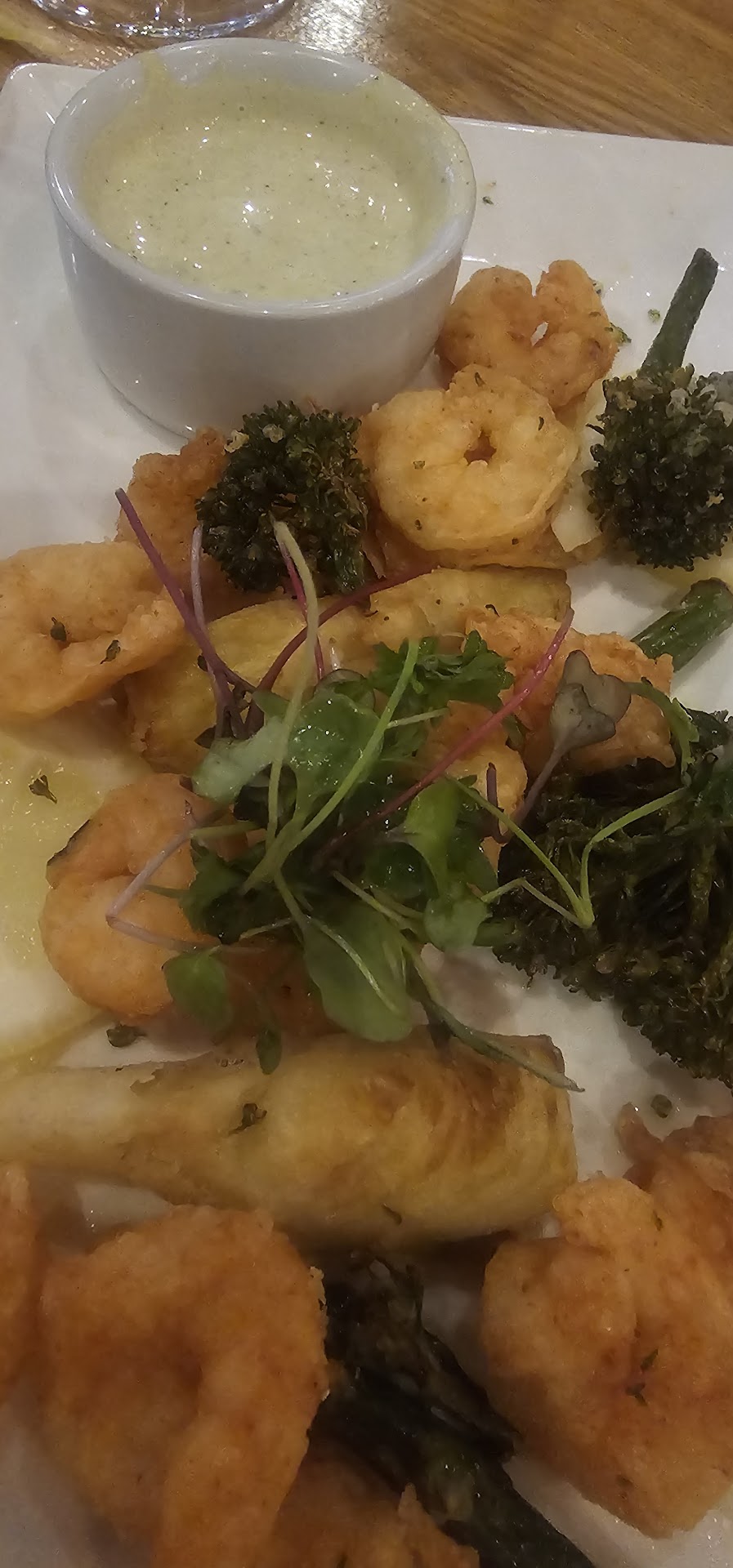 I had the salmon fish and chips and my friend had the pork belly ramen. My fish was tender, not too heavily breaded but an actual breading different than the Misto. Paired with a house tartar sauce...yum! The fries though! They were wedges but they had the best crisp on the edges especially that were full of flavor and the inside was fluffy. The ranch is also housemade and I alternated between that and the rest of the basil aoli from the misto. The slaw is also housemade and fresh.