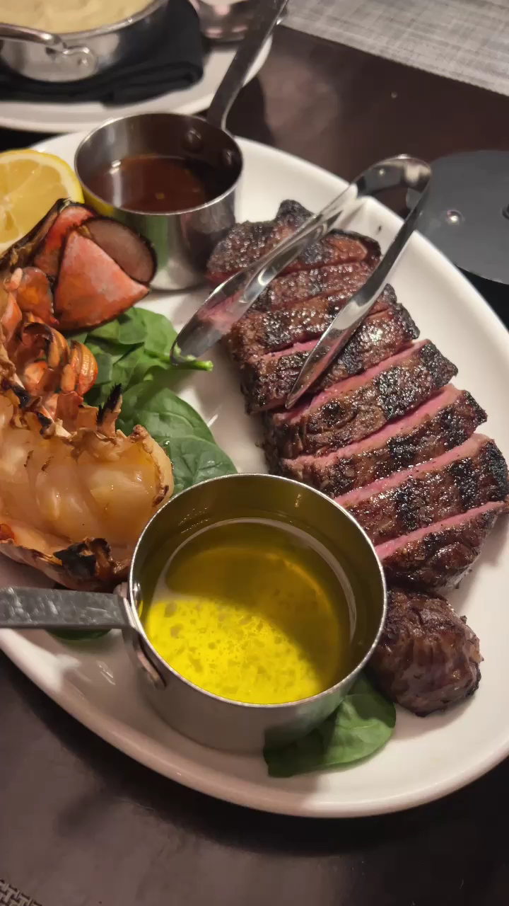 For our entree and sides we shared a 16 oz ribeye steak, 1 lb of king crab legs, baked potato, potatoes au gratin, creamed spinach, and mushroom medley. We requested the sake medium rare and it came spot on medium rare and melt in your mouth good. We had it with the sauces chimichurri and creamy horseradish.