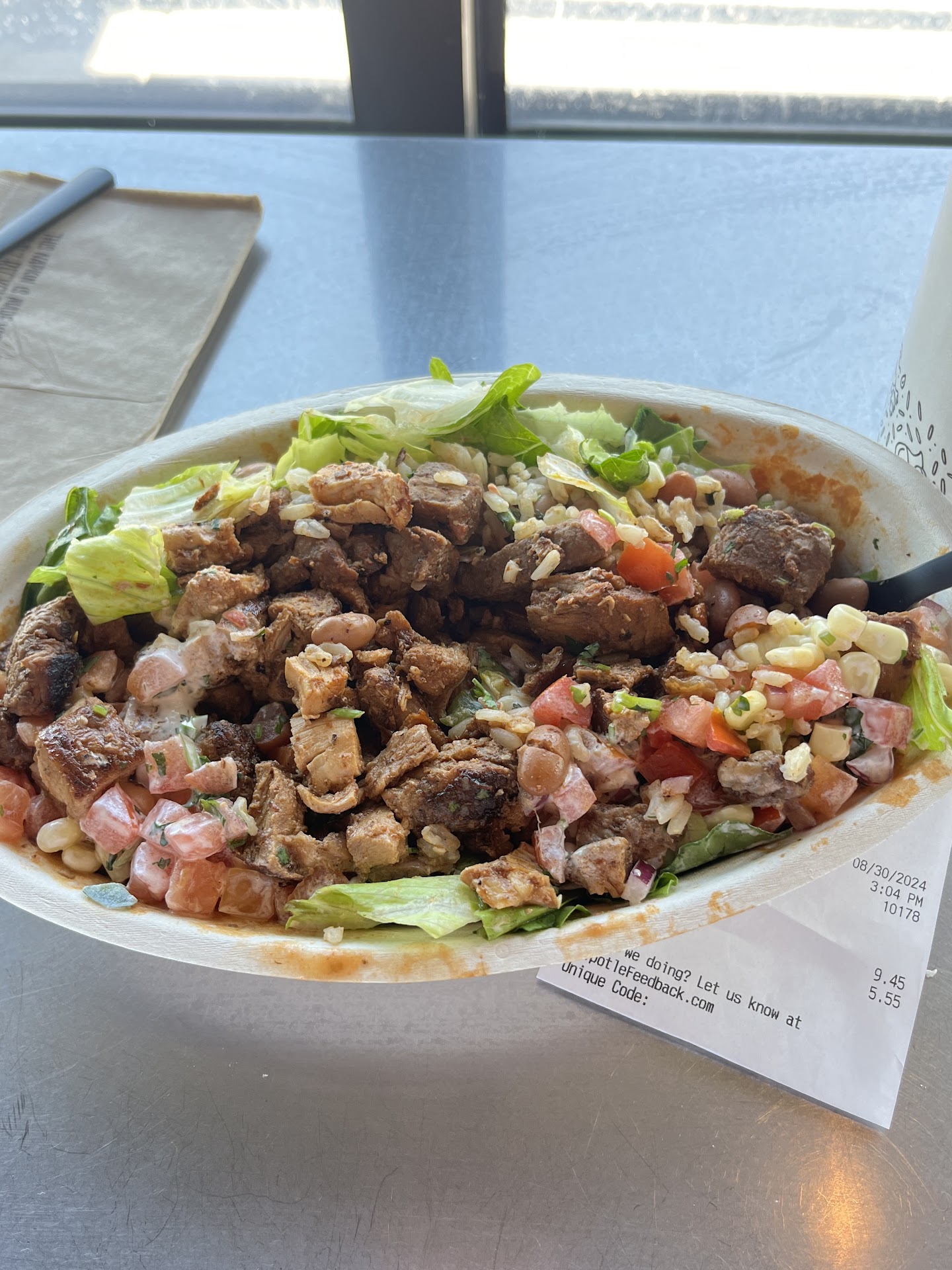 Now onward to the actual restaurant. My commentary is for this location and most other Chipotles. I will start by saying that I do enjoy the food, I wouldn't go if I didn't love the finished product. BUT something happened to Chipotle where every location is understaffed. I walked through the front door after the lunch rush and was greeted by a line of 15 people... at 2pm. The line was not moving. There was one person running the register, one person running the in restaurant serving line, and one person on the online to go orders. The person running the in restaurant serving line was running back and forth from the back, trying to refill all the missing items in the little metal holding containers. And that area was an absolute abomination beans, meat juice, rice, sauces splashed and caked all over the area where the metal containers are and where they place the bowls they fill to hand to customers. Once you get up to the front of the line, you kinda have to choose from whatever is left. I was handed a bowl that was covered in stains and food from orders past.