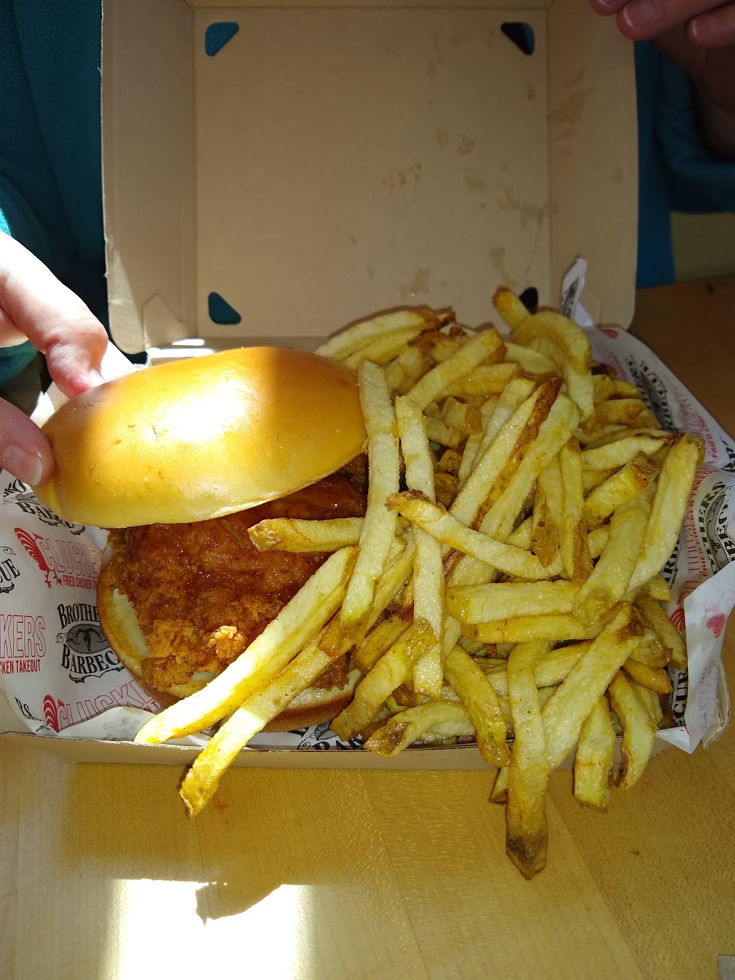 I love chicken thighs and fried chicken sandwiches so I was excited to try this. It was the worst chicken sandwich I have ever had. I didn’t know you could get fried chicken so dry. Drier than any fried chicken breast sandwich I have ever tried. It also tasted completely bland as if it was not marinated and the breading had no seasoning. It was a large sandwich though. I thought the fries were also awful, but they reminded me of In n Out fries, so if you like fries like that, that are not soaked to remove some starch before frying, you would probably like these! The fried pickles were pretty good, typical generic sliced pickles that come in 5 gallon buckets in fast food establishments, breaded and deep fried. You can share them with at least 3 people, it comes with a lot. Maybe I just got a bad sandwich, but it was so unappetizing I won’t be trying again. Two of us shared one sandwich and could barely finish it so I’m glad we didn’t each...